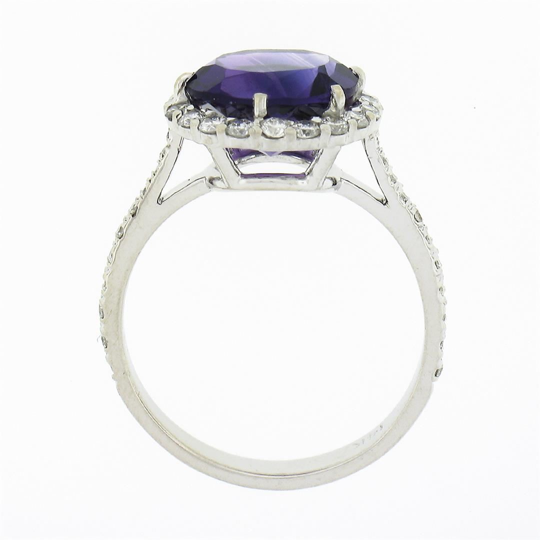 A solid 14k white gold ring, with 1 round brilliant cut natural amethyst (10mm - 3.3ct), surrounded with a halo of 39 round brilliant cut natural diamonds (G/H - VS2 ; 0.80ctw).The ring is size 7.5, weighs a total of 3.84 grams, and measures 12.85mm wide.