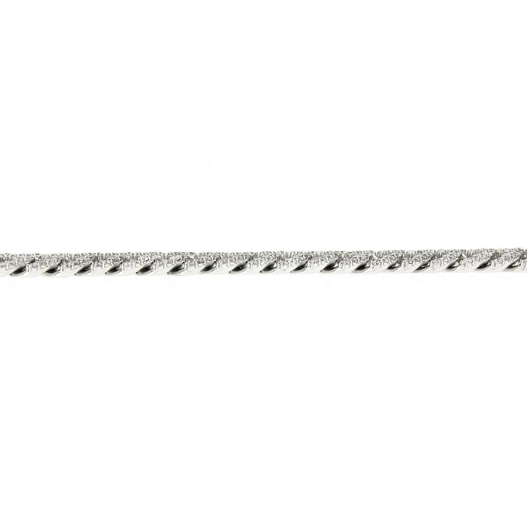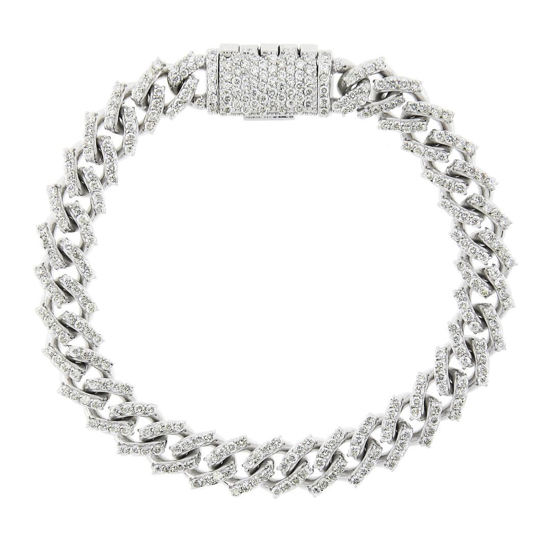 A solid 14k white gold cuban bracelet, with 326 round brilliant cut natural diamonds (G/H - VS2/SI2 w/ a few I ; 5ctw). It weighs a total of 32.30 grams, measures 9mm wide, and measures 7 inches in length.