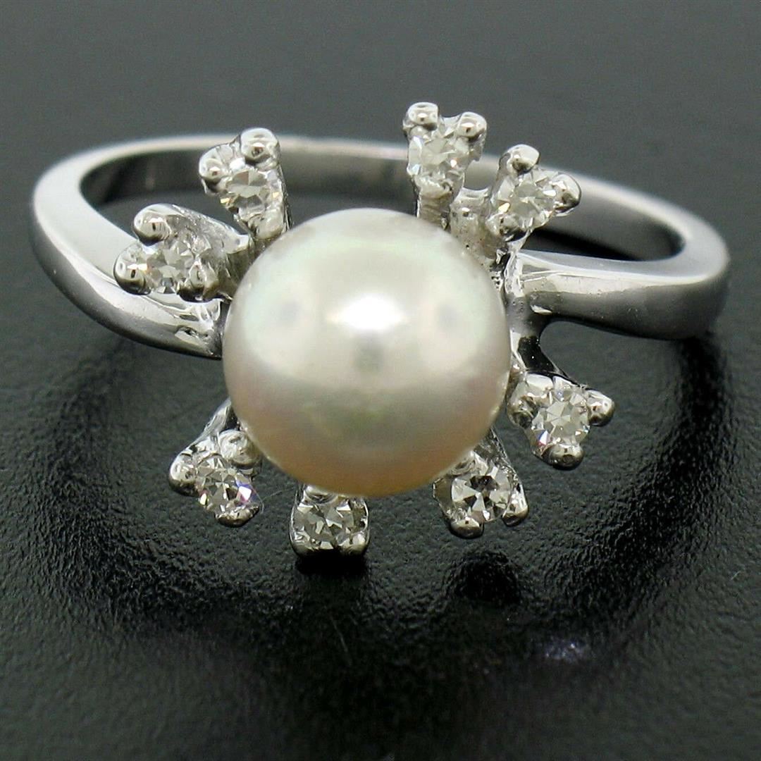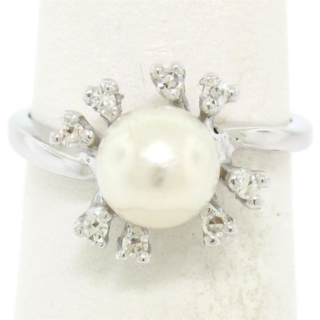 One 14K White Gold 7.5mm Round Cultured Pearl & 8 Single Cut Diamond Petite Cluster Ring. Item Details: Material: 14K Solid White Gold, Weight: 4.11 Grams, Stone(s): (1) Cultured Pearl - Round Shape - Stem Set - Ivory Color w/ Pink and Green Overtones - Gorgeous Luster - 7.5mm (approx.), (8) Natural Genuine Diamonds - Round Single Cut - Prong Set - F Color - VS1 Clarity - 0.12ctw (approx.), Ring Size: 6.0 , Ring Width: 12.53mm, Ring Height: 10.38mm rise off the finger, Condition: Like New!