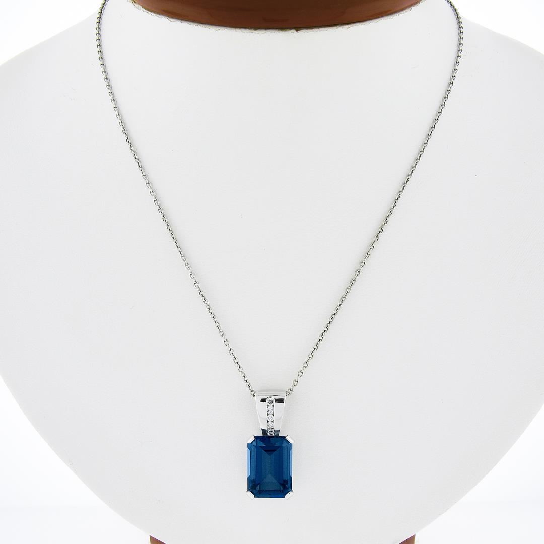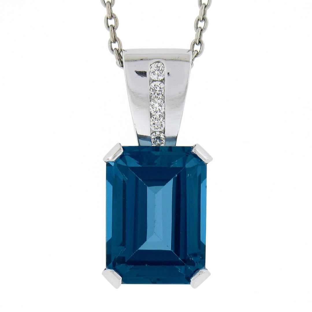 A solid 14k white gold pendant necklace, with 1 emerald cut natural london blue topaz (13.75x10mm / 9.0ct), and 5 round brilliant cut natural diamonds (H/I - VS2/SI1 ; 0.10ctw). 17 inch cable link chain, 8.70 grams total weight, pendant measures 24.1x10.9mm.