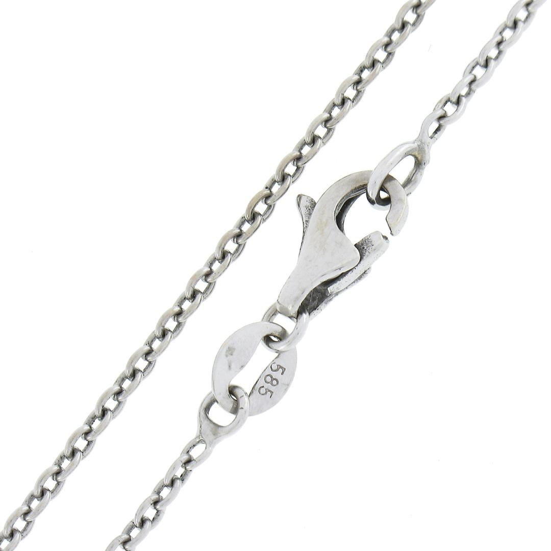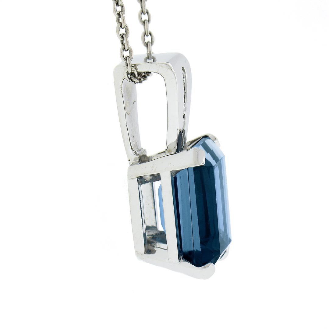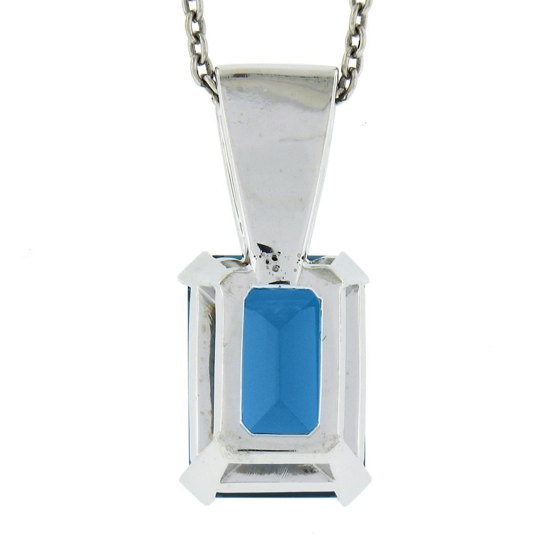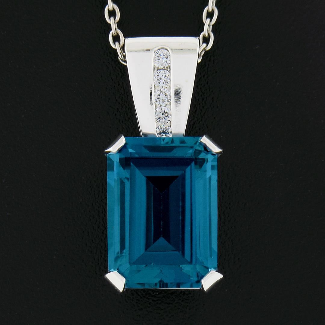 A solid 14k white gold pendant necklace, with 1 emerald cut natural london blue topaz (13.75x10mm / 9.0ct), and 5 round brilliant cut natural diamonds (H/I - VS2/SI1 ; 0.10ctw). 17 inch cable link chain, 8.70 grams total weight, pendant measures 24.1x10.9mm.
