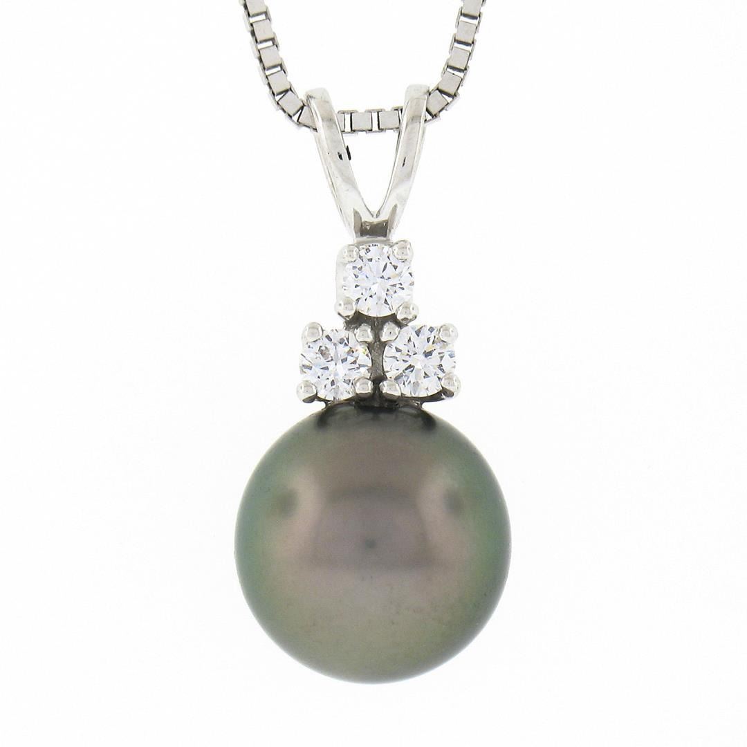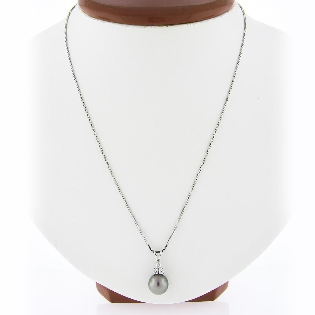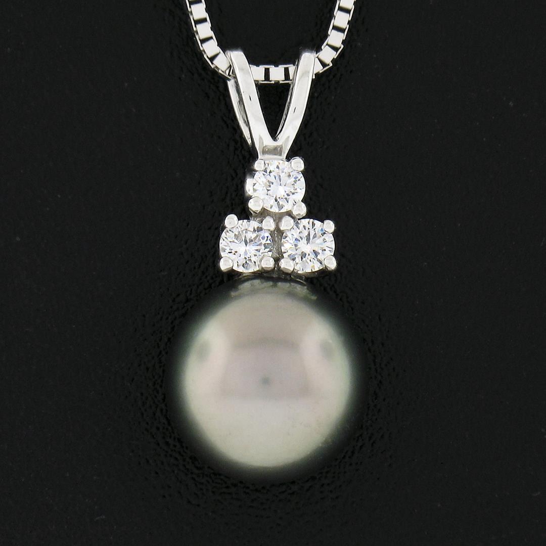 A solid 14k white gold pendant necklace, featuring 1 round shape cultured Tahitian pearl (9.18mm), and 3 round brilliant cut natural diamonds (F/G - VS1/VS2 ; 0.15ctw). 17 inch box link chain, 3.95 grams total weight, pendant measures 20x9.18mm.