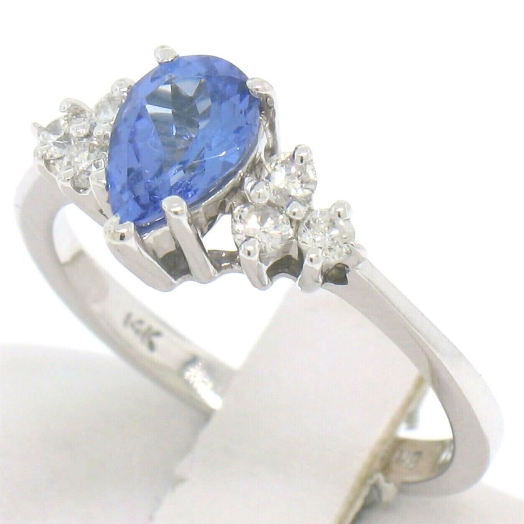 An estate solid 14k white gold solitaire ring, featuring 1 pear cut natural tanzanite (0.75ct), accented with 6 round brilliant cut natural diamonds (E/F- VS1/VS2; 0.18ctw). The ring is size 5.5, weighs a total of 2.40 grams, and measures 7.68mm wide.