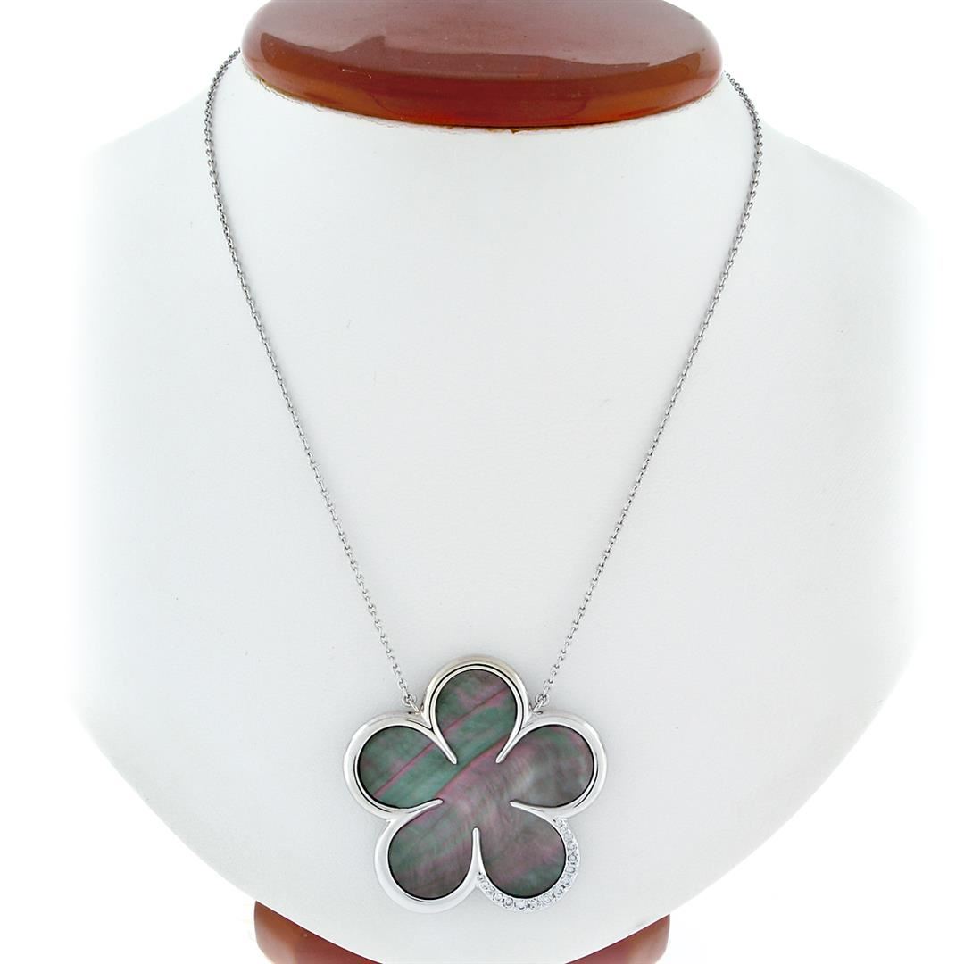 A solid 14k white gold flower pendant necklace, with 1 custom shape cultured mother of pearl, and 16 round brilliant cut natural diamonds (G/H - SI1; 0.30ctw). Adjustable 16 or 18 inch cable link chain, 17.55 grams total weight, pendant measures 38.4x39.45mm.