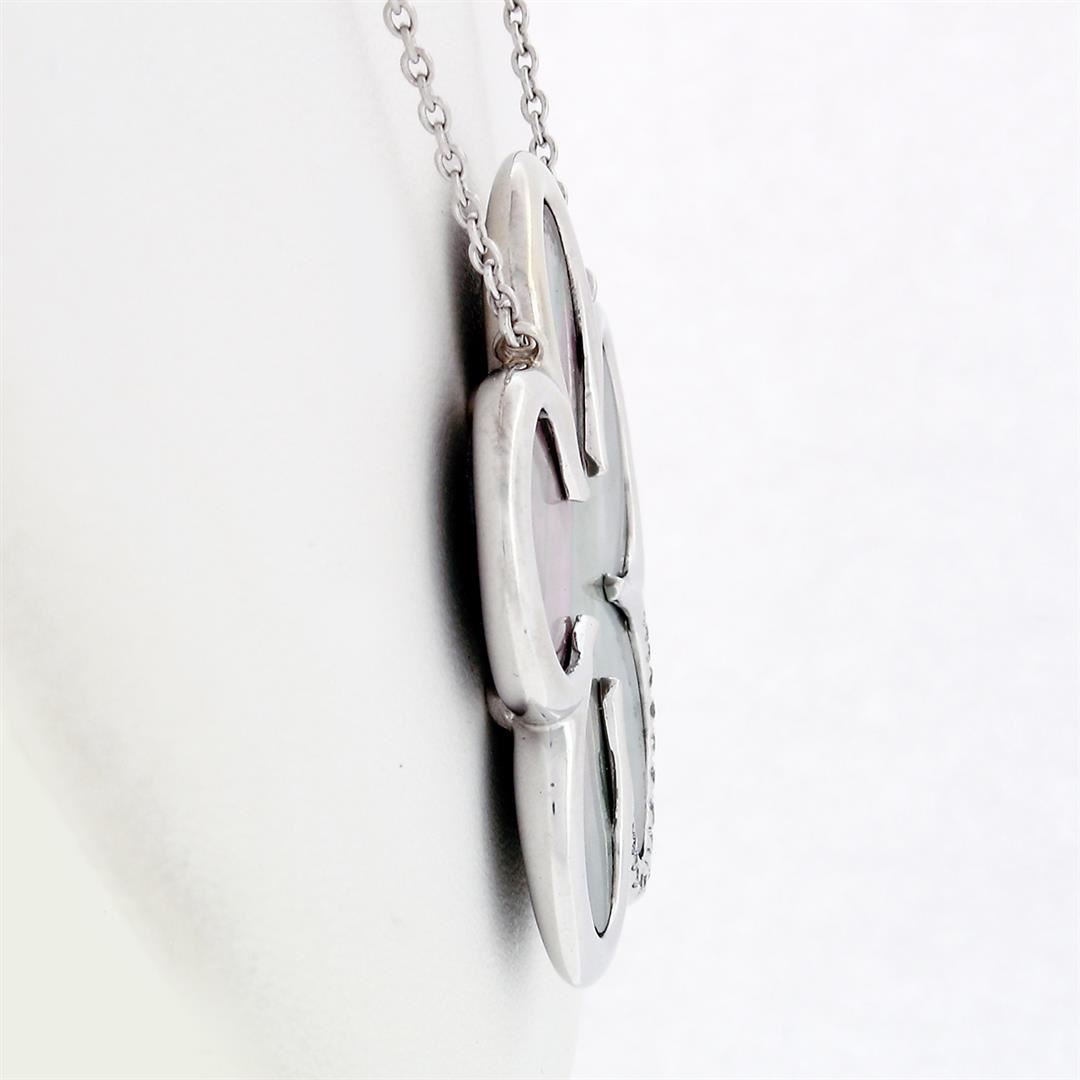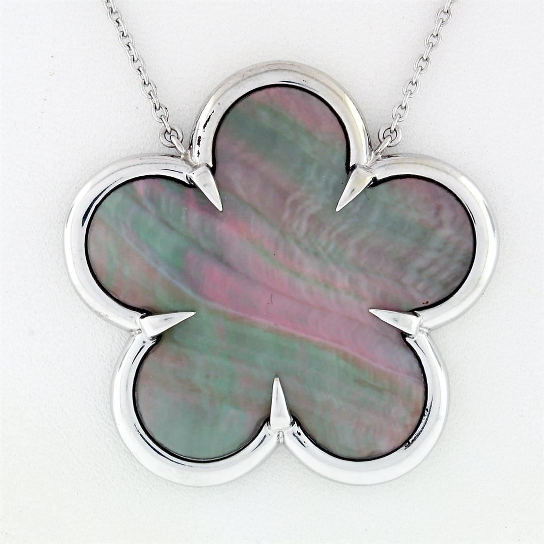 A solid 14k white gold flower pendant necklace, with 1 custom shape cultured mother of pearl, and 16 round brilliant cut natural diamonds (G/H - SI1; 0.30ctw). Adjustable 16 or 18 inch cable link chain, 17.55 grams total weight, pendant measures 38.4x39.45mm.