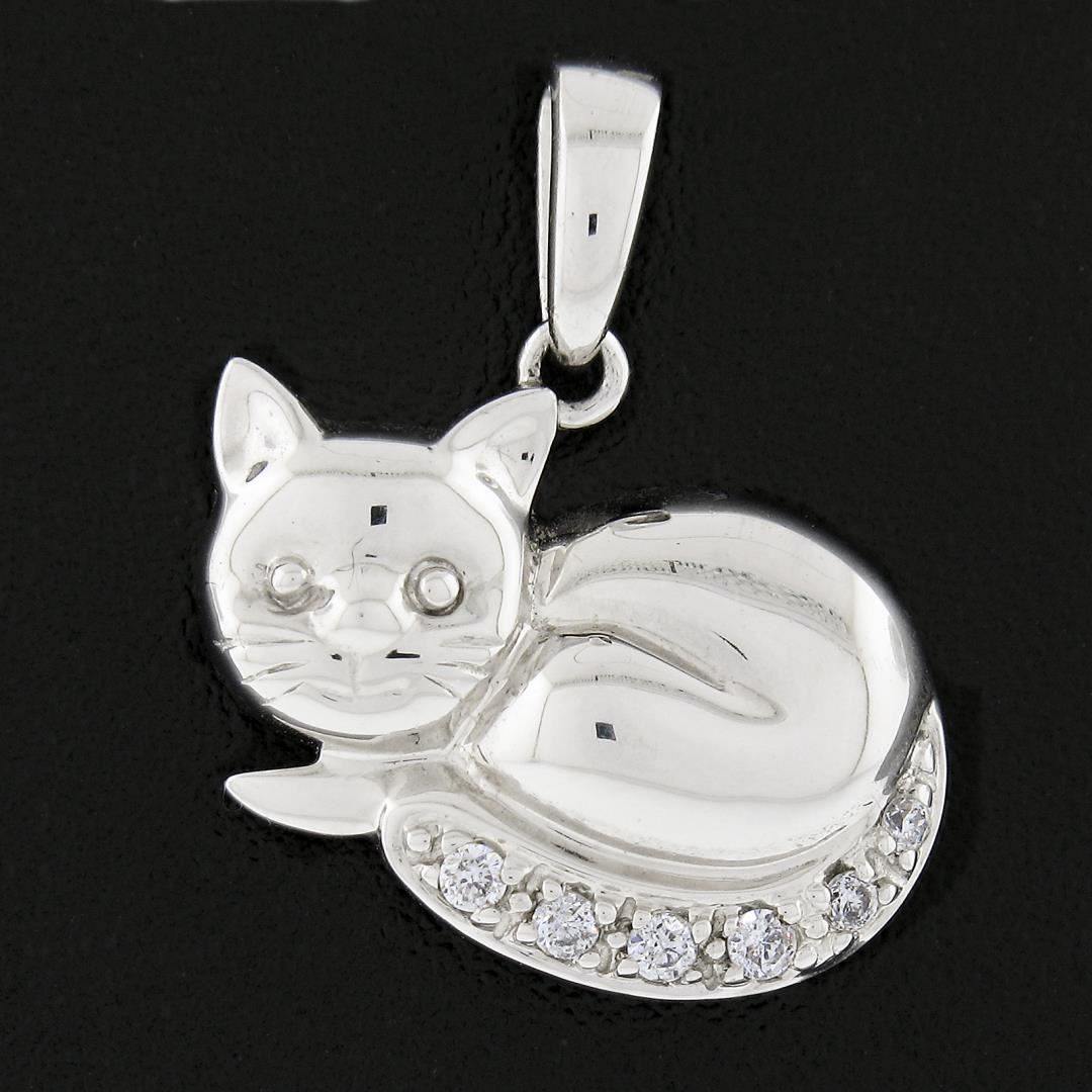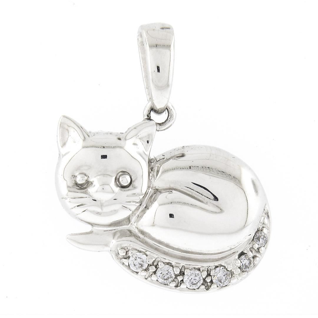 A solid 14k white gold cat pendant, with 6 round brilliant cut natural diamonds (G/H - VS1/VS2 ; 0.05ctw). The pendant weighs a total of 1.61 grams, measures 17.20x14.30mm including the bail, and the inside of the bail measures 4x1.6mm.