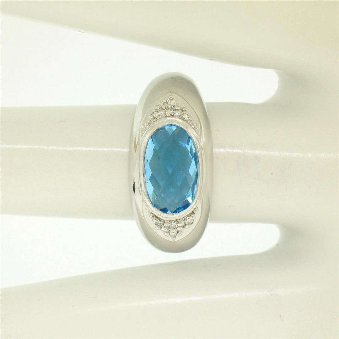 One 14K White Gold Oval Checkerboard Cut Bezel Blue Topaz Solitaire & Diamond Ring. Item Details - Material: 14K Solid White Gold, Weight: 4.3 Grams, Stone(s): (1) Natural Genuine Topaz - Pointed Oval Checkerboard Cut - Bezel Set - Rich Blue Color - 2.40ct (exact), (8) Natural Genuine Diamonds - Round Brilliant Cut - Pavé Set - F Color - SI1 Clarity - 0.08ctw (approx.), Total Carat Weight: 2.48 (approx.), Ring Size: 6.0, Ring Width: 9.5mm, Ring Height: 7mm rise off the finger, Signature: 14K 2.40, Condition: Like New!