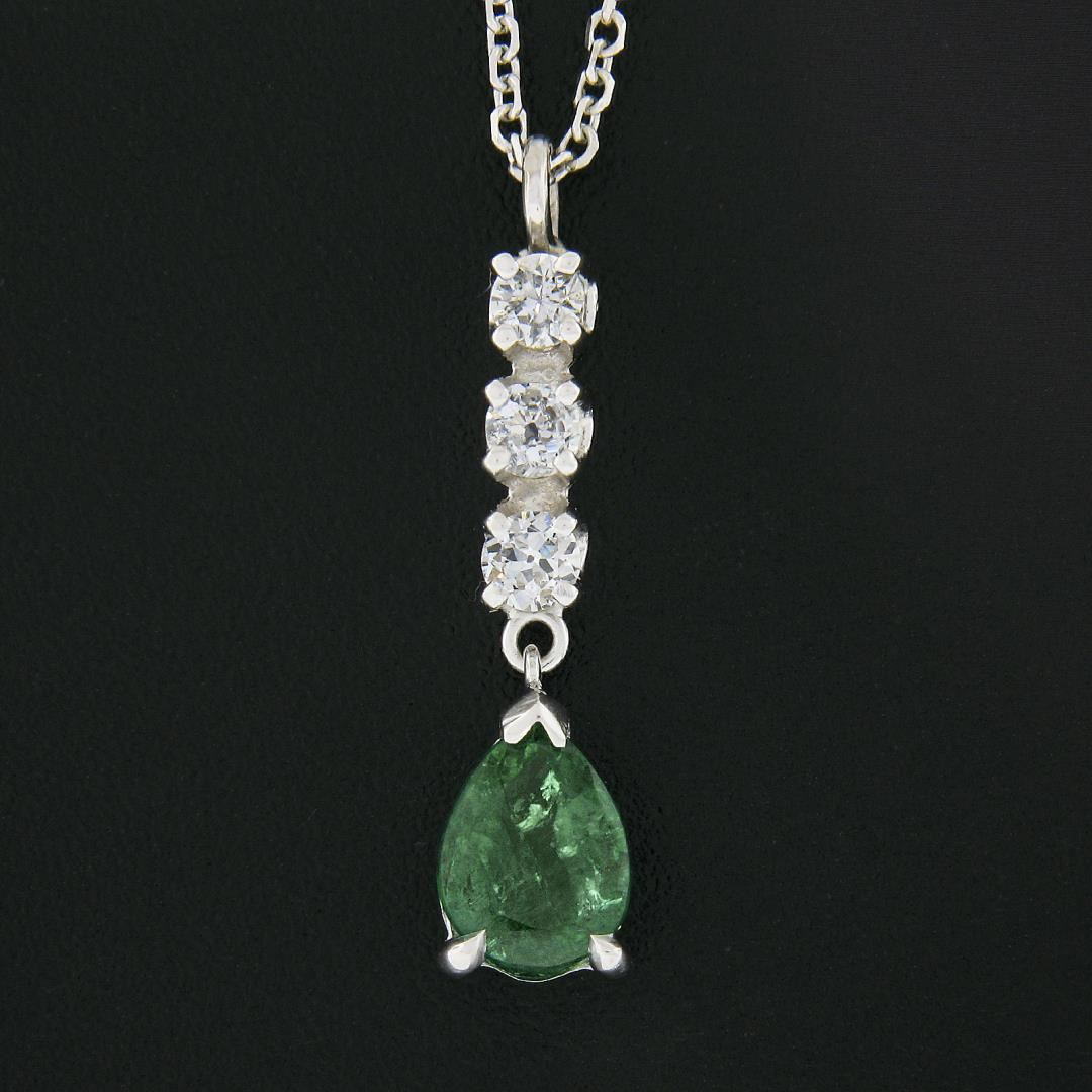 A solid 14k white gold dangle pendant necklace, with 1 pear cut natrual emerald (0.85ct ), and 3 old european cut natural diamonds (G/H - SI1/SI2 ; 0.21ctw). Adjustable to 16 or 18 inch cable link chain, 2.75 grams total weight, pendant measures 24.4x5.6mm.