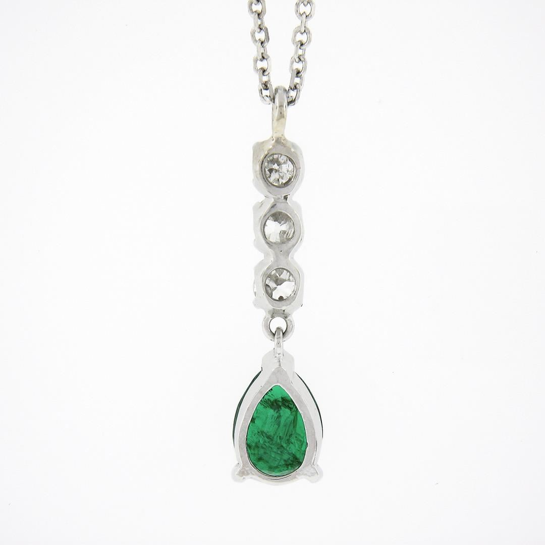 A solid 14k white gold dangle pendant necklace, with 1 pear cut natrual emerald (0.85ct ), and 3 old european cut natural diamonds (G/H - SI1/SI2 ; 0.21ctw). Adjustable to 16 or 18 inch cable link chain, 2.75 grams total weight, pendant measures 24.4x5.6mm.