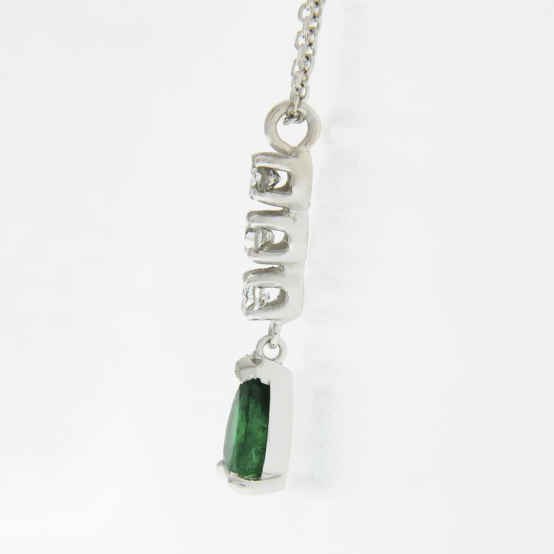 A solid 14k white gold dangle pendant necklace, with 1 pear cut natrual emerald (0.85ct ), and 3 old european cut natural diamonds (G/H - SI1/SI2 ; 0.21ctw). Adjustable to 16 or 18 inch cable link chain, 2.75 grams total weight, pendant measures 24.4x5.6mm.