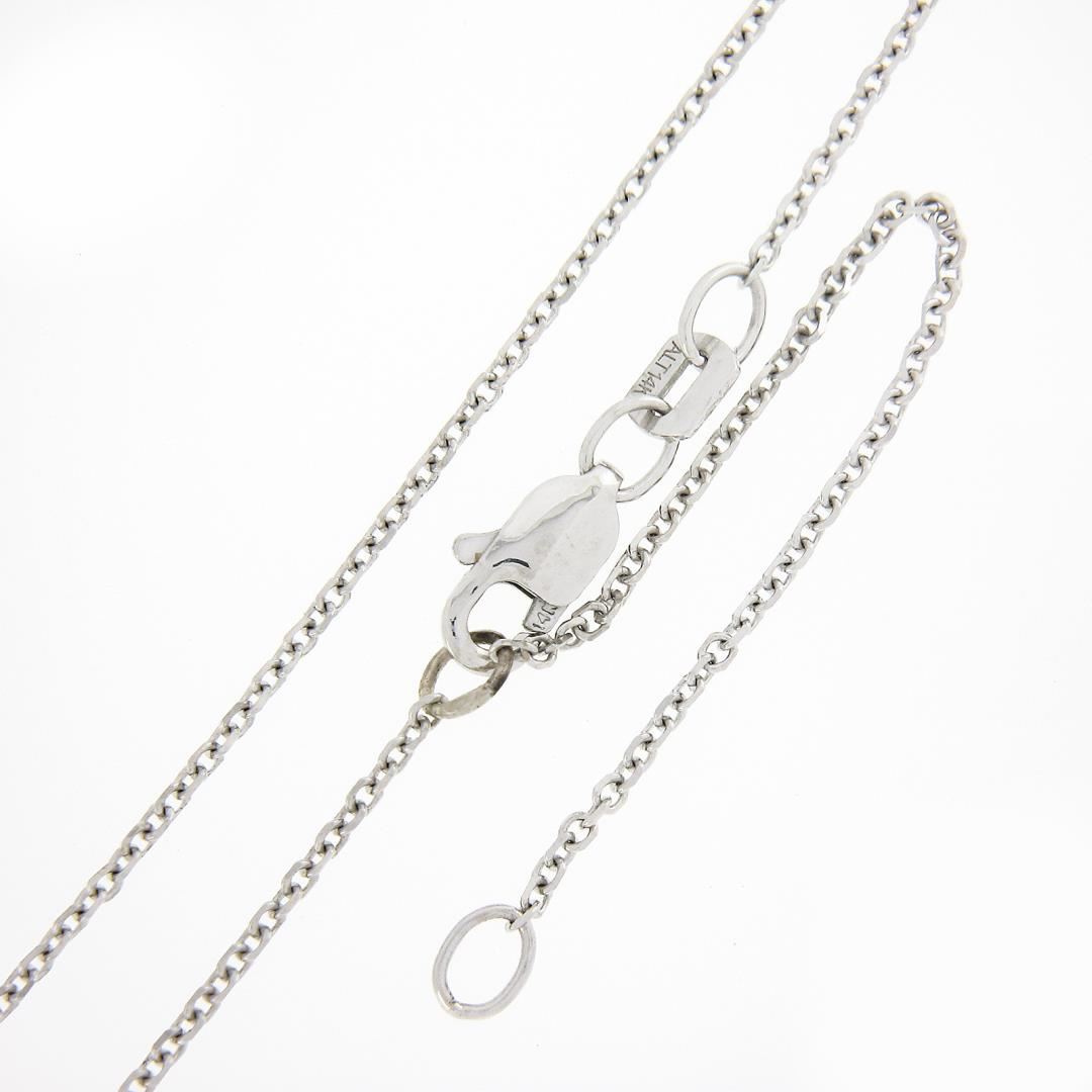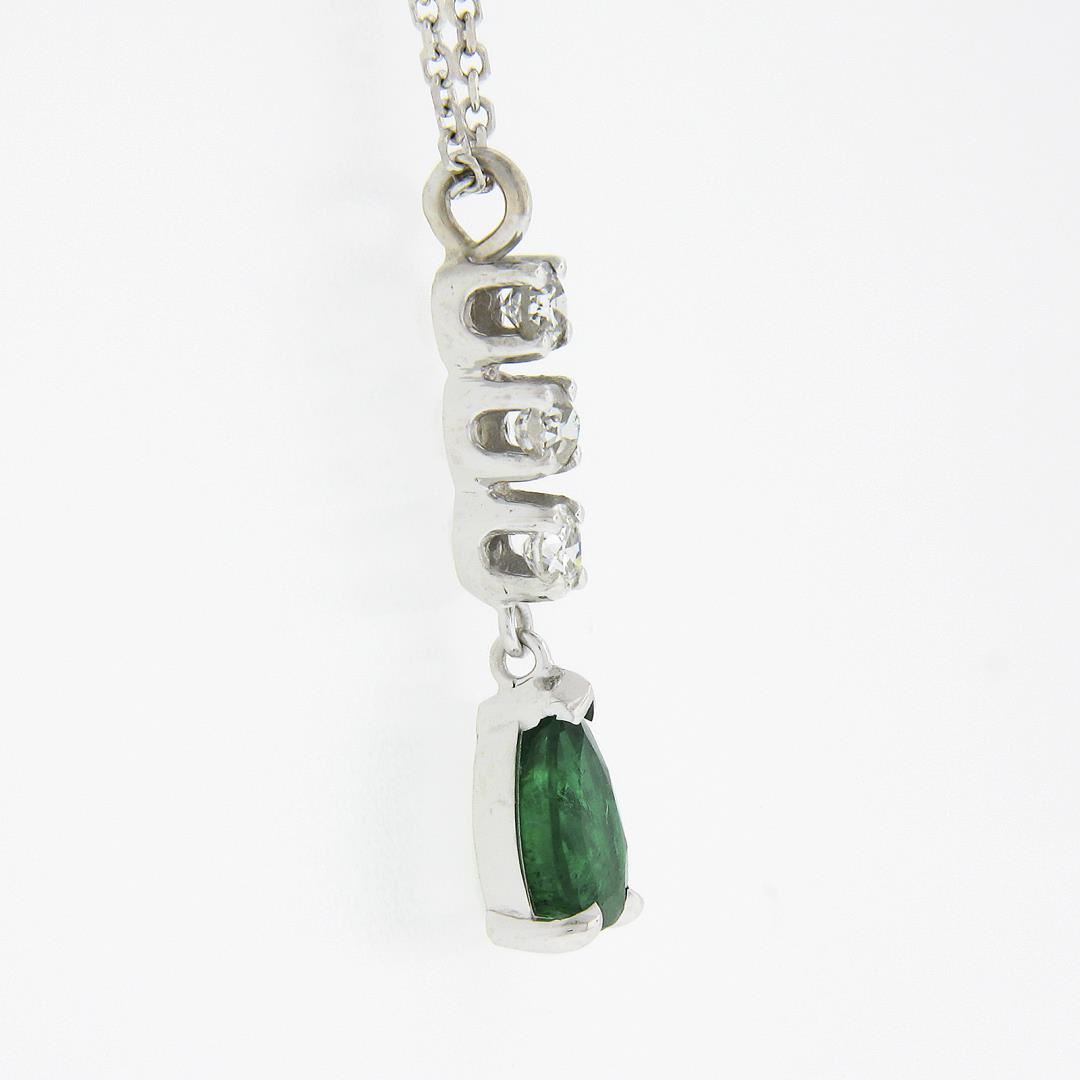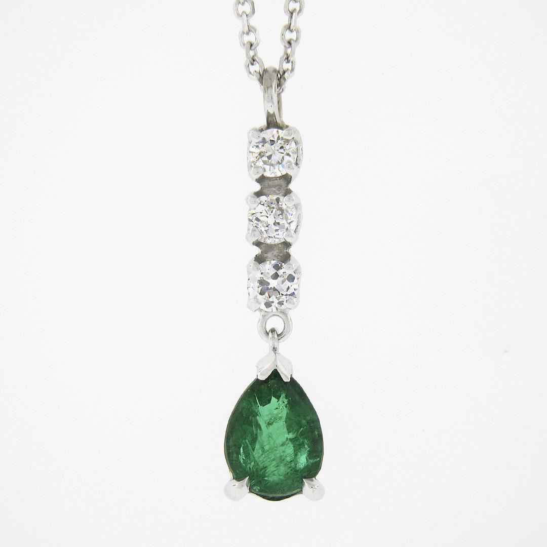 A solid 14k white gold dangle pendant necklace, with 1 pear cut natrual emerald (0.85ct ), and 3 old european cut natural diamonds (G/H - SI1/SI2 ; 0.21ctw). Adjustable to 16 or 18 inch cable link chain, 2.75 grams total weight, pendant measures 24.4x5.6mm.