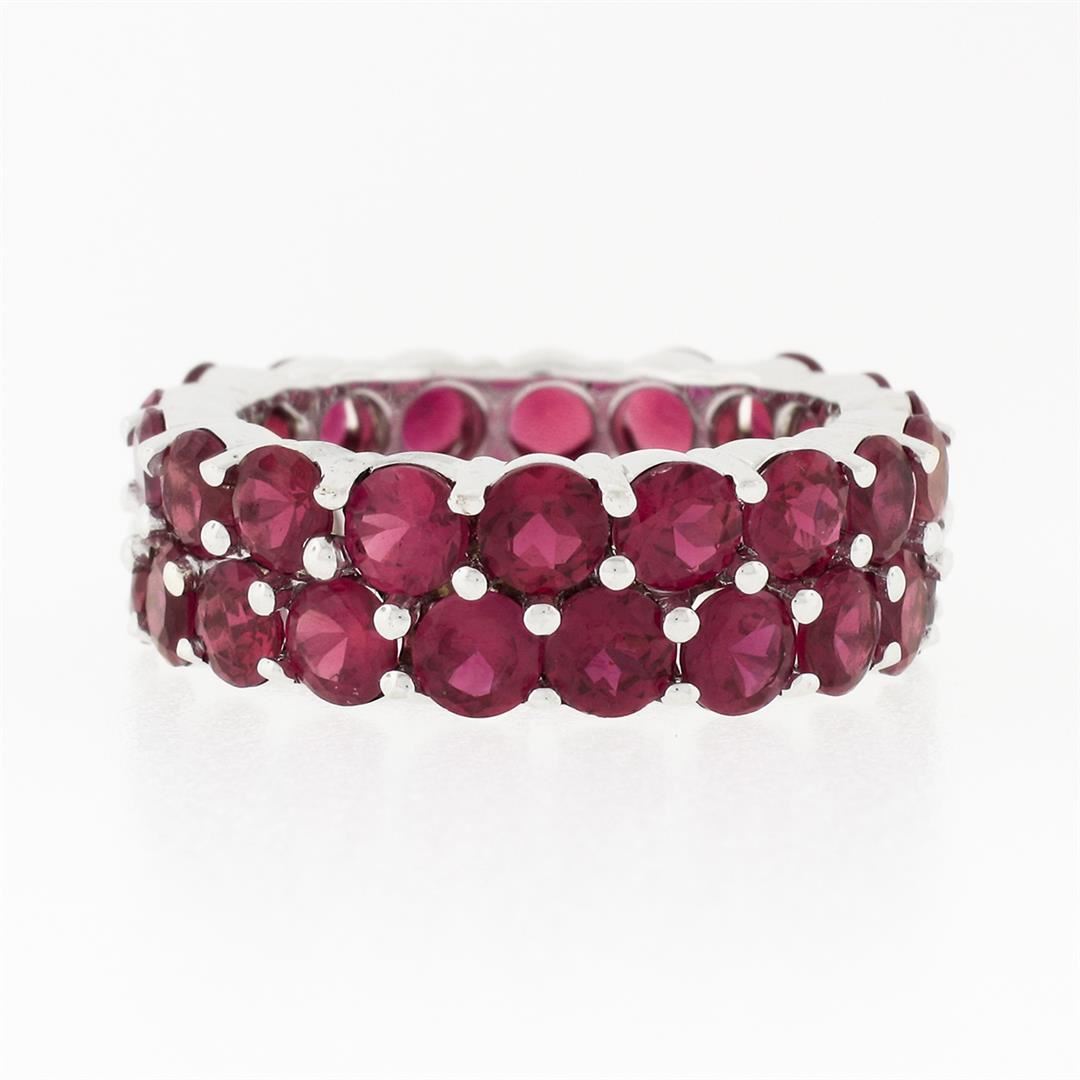 A solid 14k white gold eternity band ring, with 36 round brilliant cut red stones (3.6mm each). The ring is size 6.0, weighs a total of 7.42 grams, and measures 7.1mm wide.