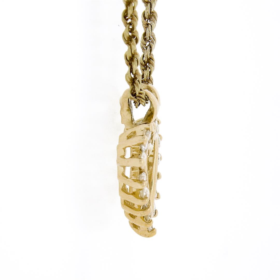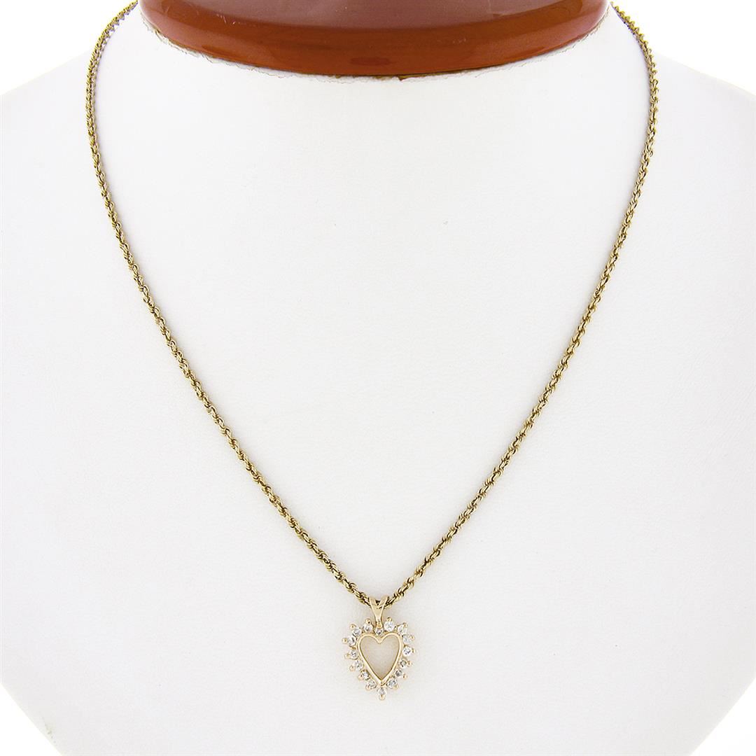 A solid 14k yellow gold heart pendant necklace, with 16 round brilliant cut natural diamonds (G/H - SI2/I1; 0.30ctw). The pendant weighs a total of 4.50 grams, measures 15.70x11.20mm including the bail, and 15.5 inch rope link chain.