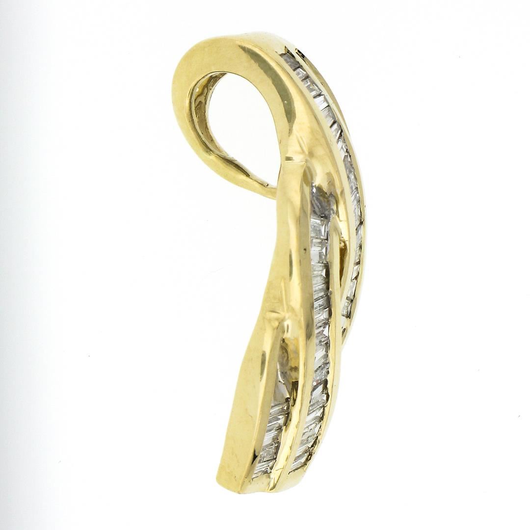A solid 14k yellow gold slide pendant, featuring 40 straight and tapered baguette cut natural diamonds (H/I - SI1/I1 ; 0.80ctw). The pendant weighs a total of 4.67 grams, measures 30.20x10.50mm including the bail, and the inside of the bail measures 8.3x6mm.