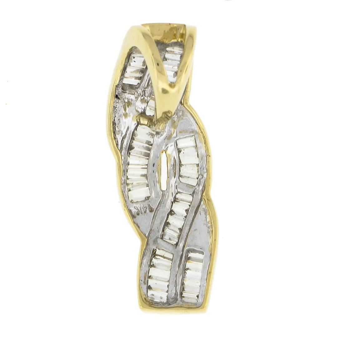 A solid 14k yellow gold slide pendant, featuring 40 straight and tapered baguette cut natural diamonds (H/I - SI1/I1 ; 0.80ctw). The pendant weighs a total of 4.67 grams, measures 30.20x10.50mm including the bail, and the inside of the bail measures 8.3x6mm.
