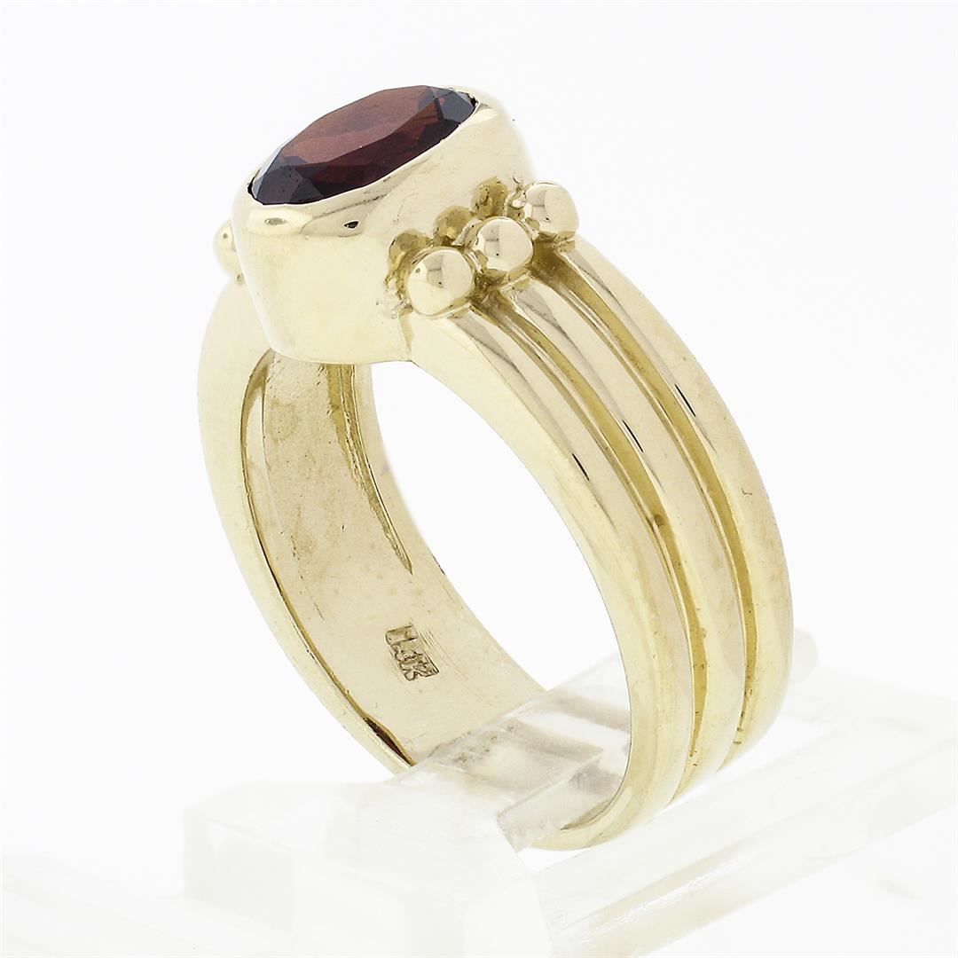 14K Yellow Gold 1.30 ctw Bezel Set Oval Garnet Solitaire Grooved Wide Band Ring