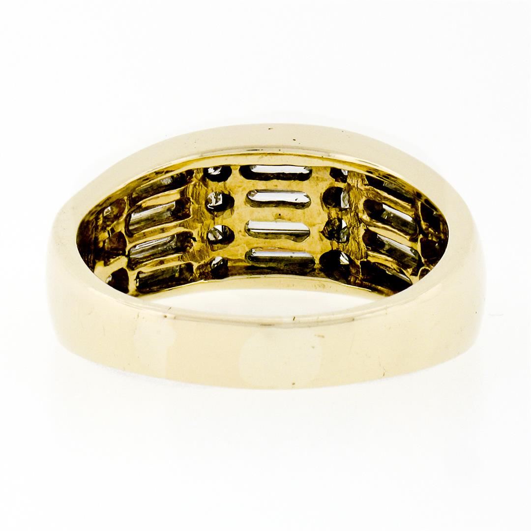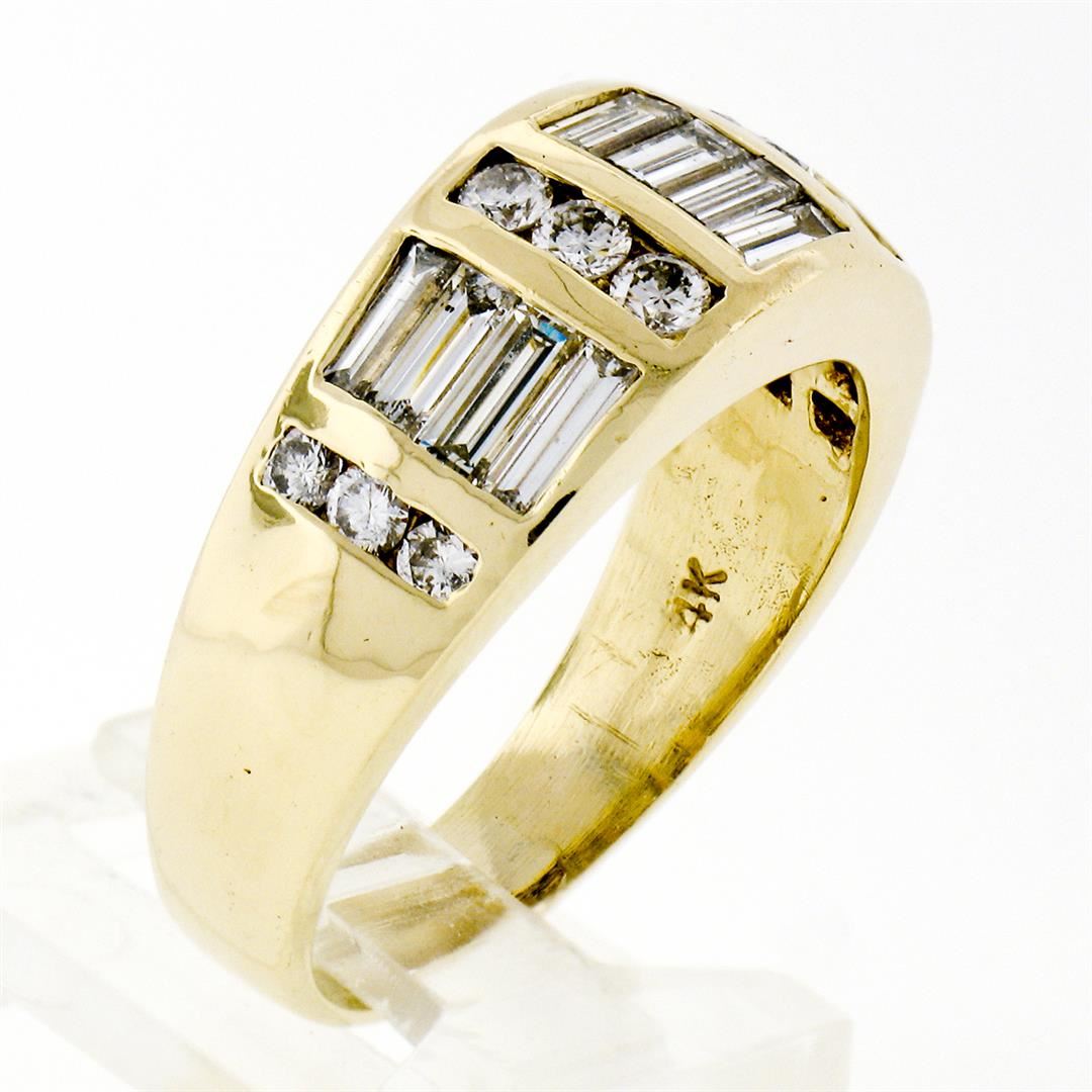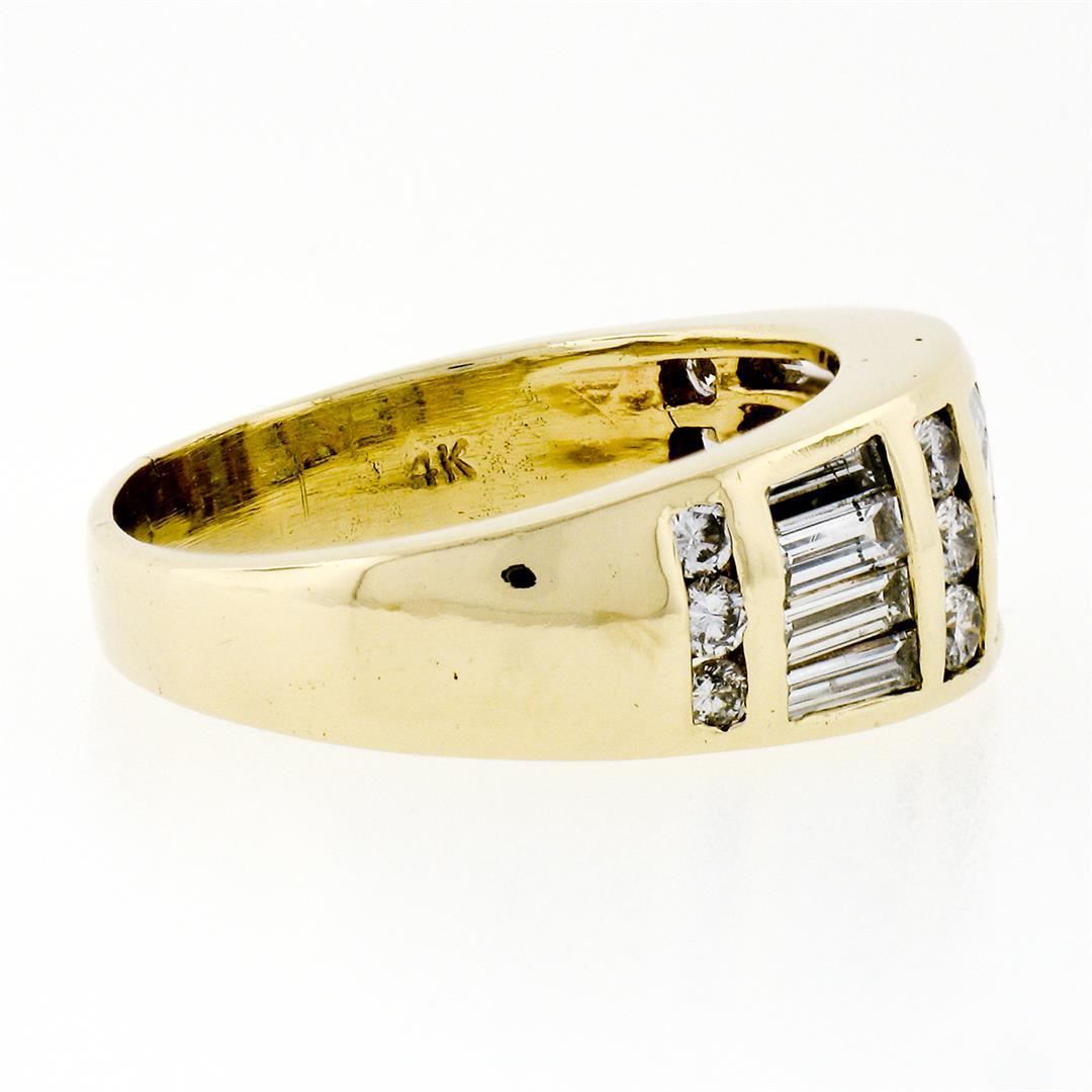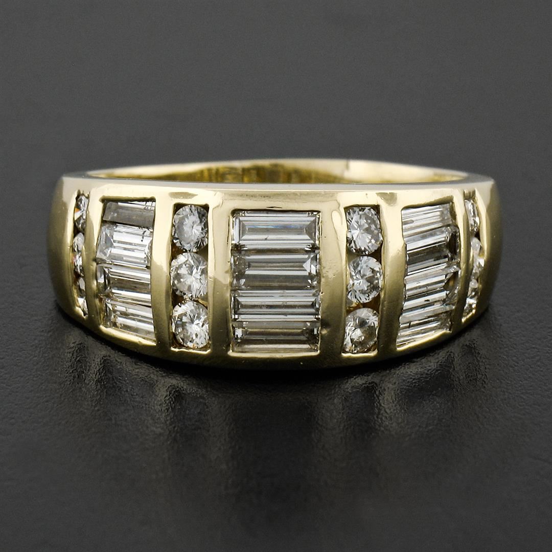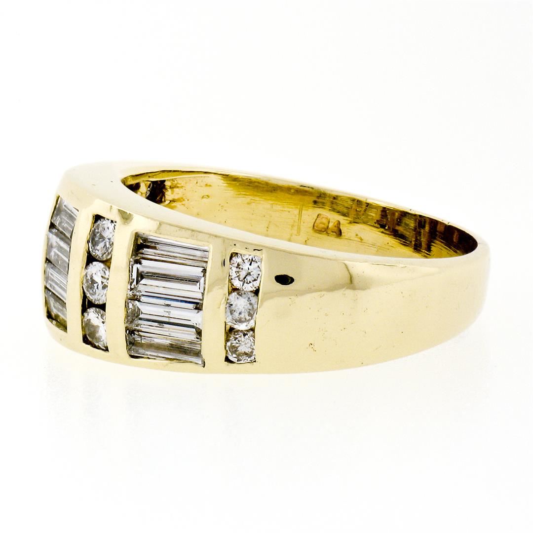 An estate solid 14k yellow gold wide band ring, featuring 12 round brilliant cut natural diamonds (G/H - VS2/SI1 ; 0.48ctw), and 12 baguette cut natural diamonds (G/H - VS2/SI1 ; 1.40ctw ). The ring is size 9.5, weighs a total of 7.58 grams, and measures 9.0mm wide.