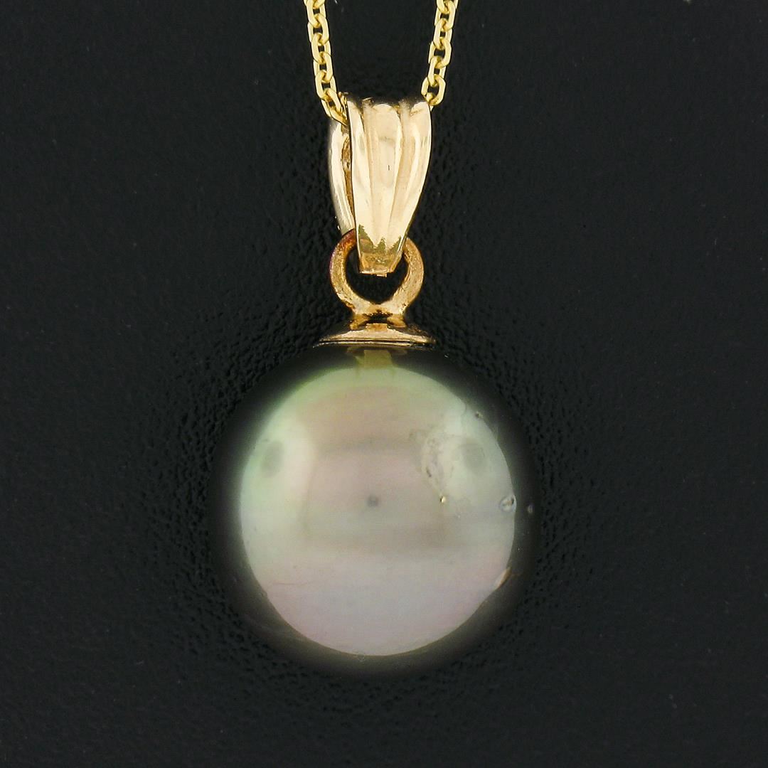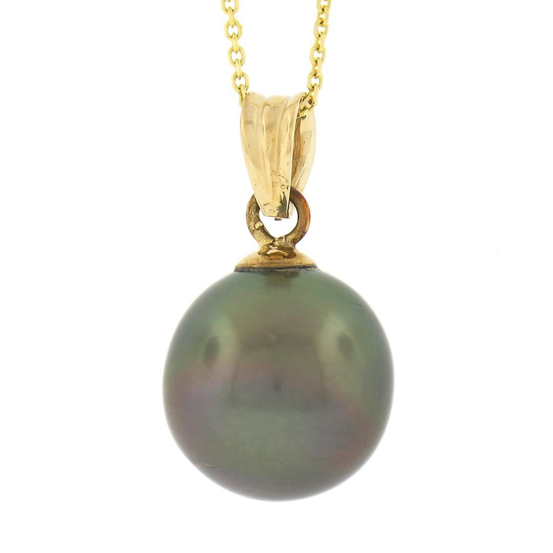 a solid 14k yellow gold pendant necklace, featuring 1 round shape cultured tahitian pearl (11.5mm). 18 inch cable link chain, 3.81 grams total weight, pendant measures 20.3x11.50mm.