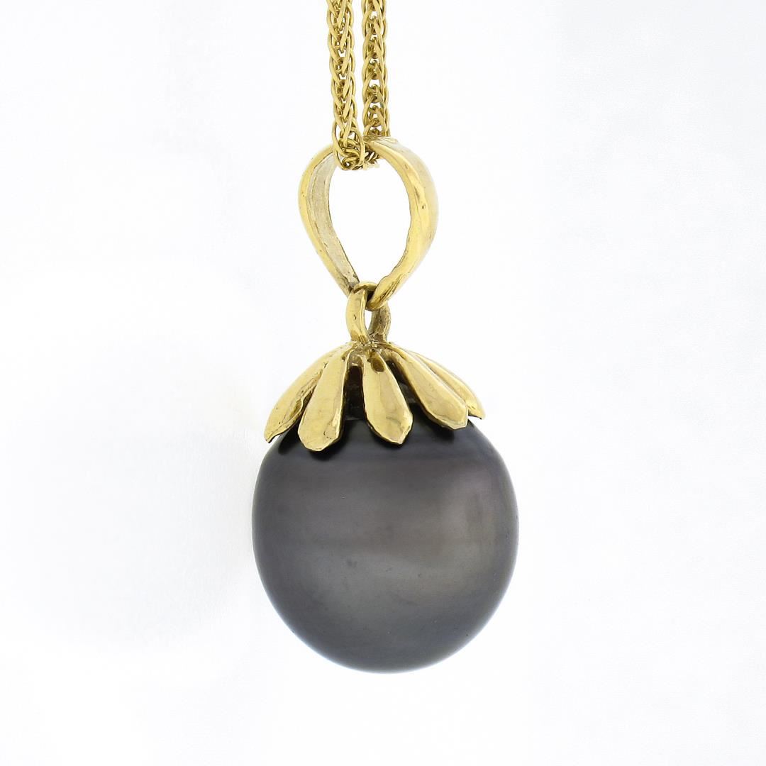 A solid 14k yellow gold pendant necklace, with 1 round shape Tahitian pearl (11.8mm). 16 inch wheat link chain, 5.21 grams total weight, pendant measures 23.6x11.8mm.