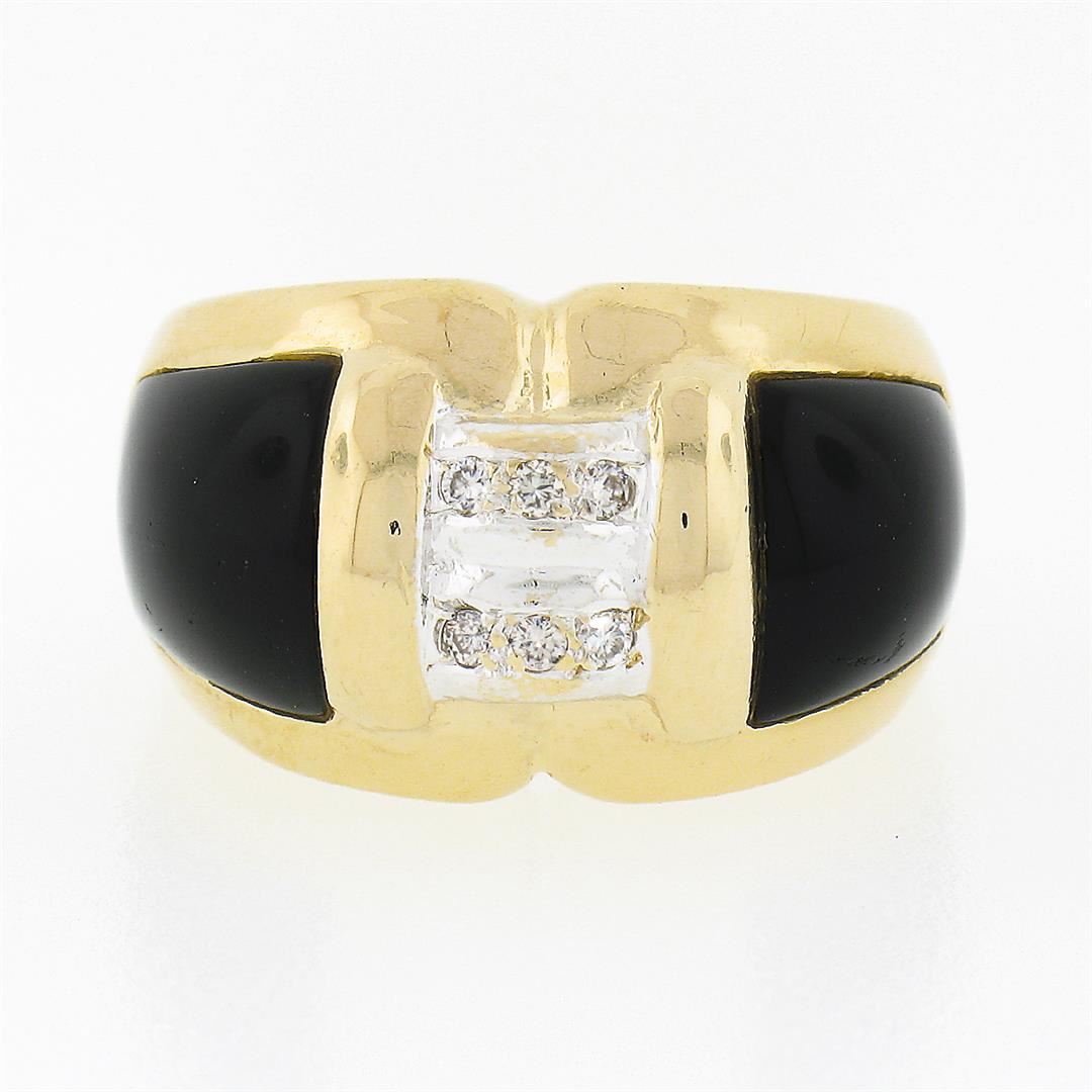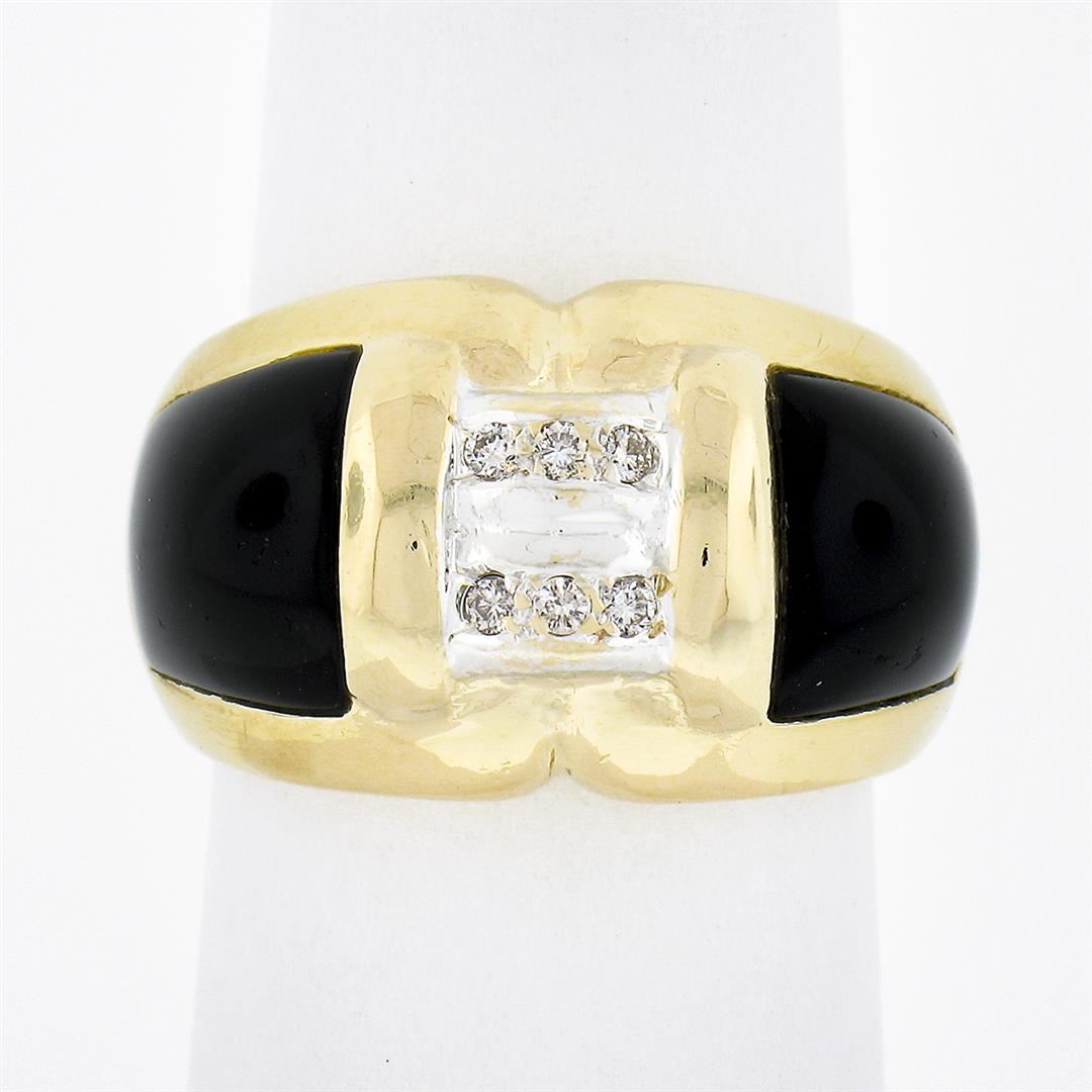 A solid 14k yellow gold wide dome band ring, with 6 round brilliant cut natural diamonds (H/I - VS2 ; 0.12ctw), and 2 cushion cabochon cut natural black onyx (10.1x9mm each). The ring is size 6.5, weighs a total of 8.0 grams, and measures 13.30mm wide.