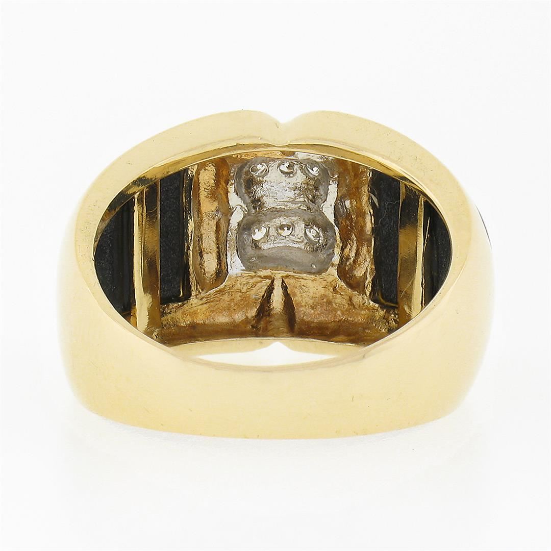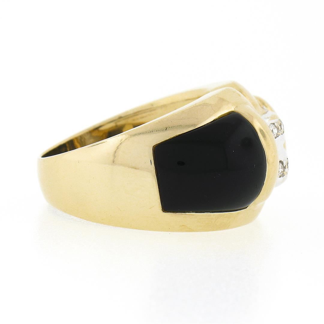 A solid 14k yellow gold wide dome band ring, with 6 round brilliant cut natural diamonds (H/I - VS2 ; 0.12ctw), and 2 cushion cabochon cut natural black onyx (10.1x9mm each). The ring is size 6.5, weighs a total of 8.0 grams, and measures 13.30mm wide.