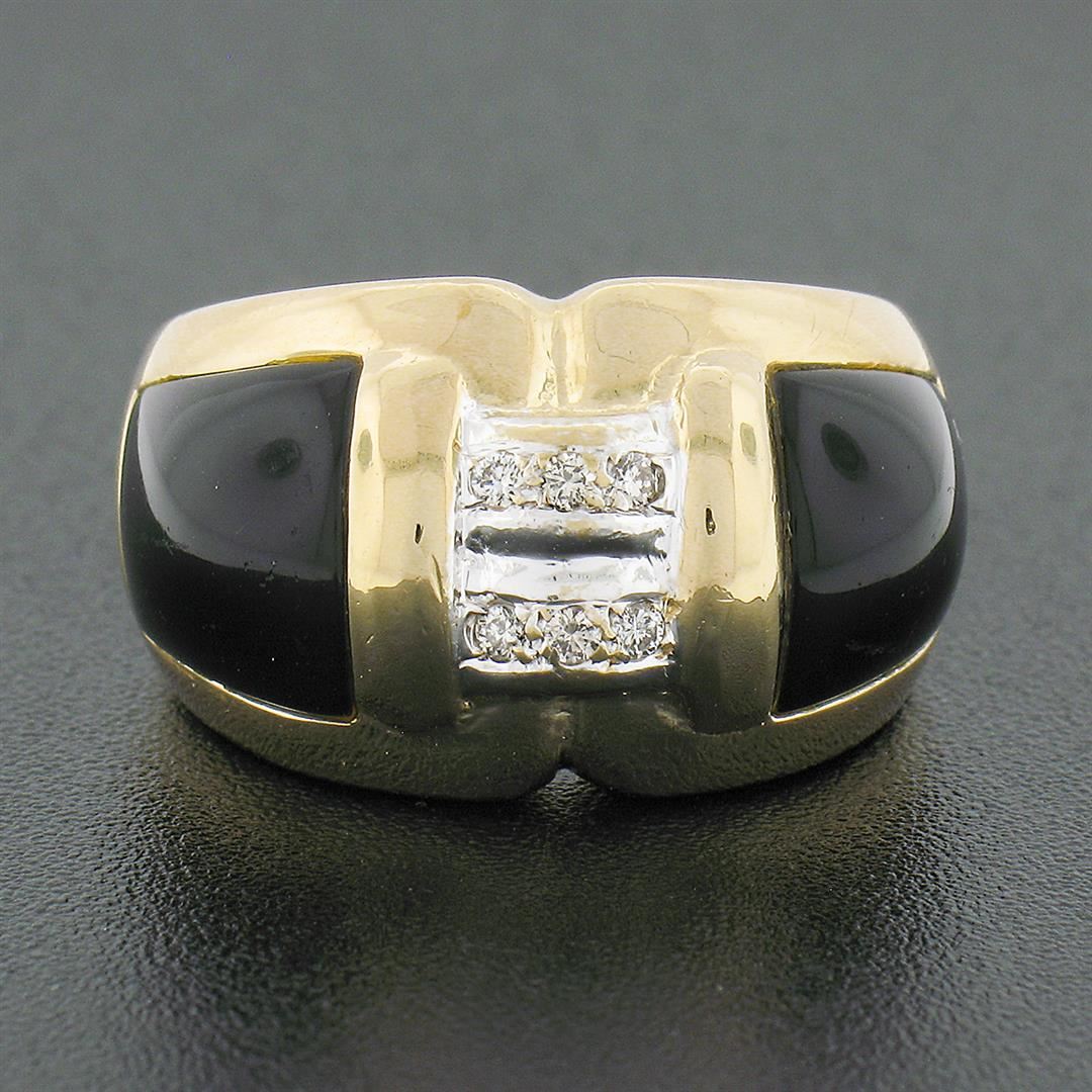 A solid 14k yellow gold wide dome band ring, with 6 round brilliant cut natural diamonds (H/I - VS2 ; 0.12ctw), and 2 cushion cabochon cut natural black onyx (10.1x9mm each). The ring is size 6.5, weighs a total of 8.0 grams, and measures 13.30mm wide.