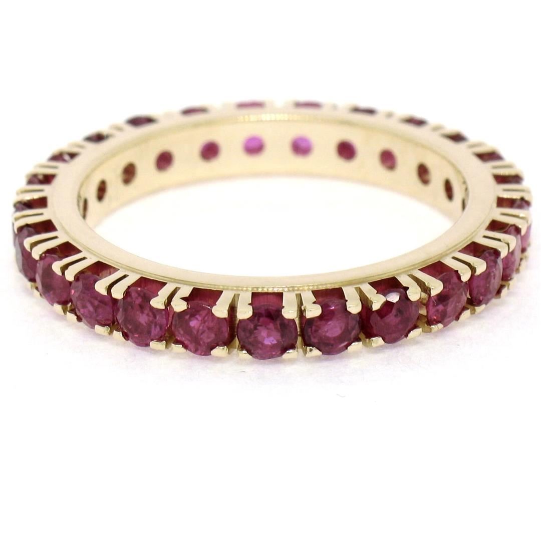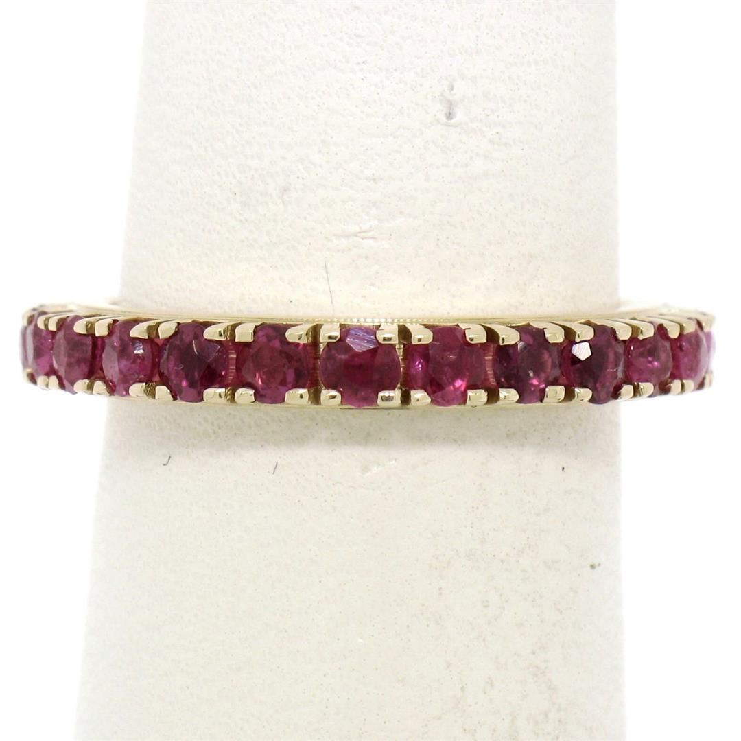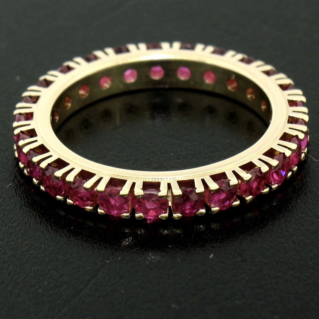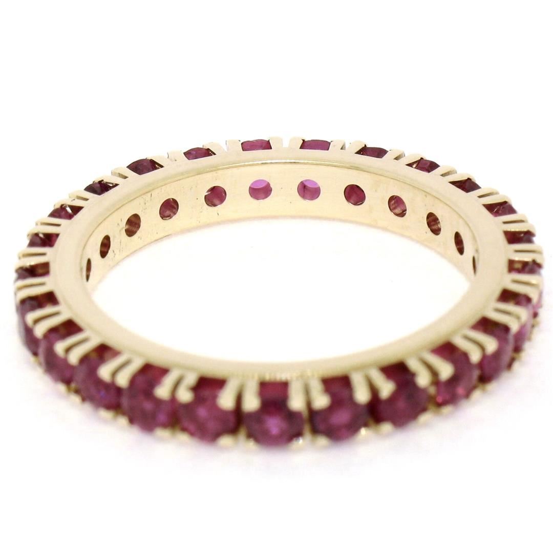 An estate solid 14k yellow gold eternity band ring, featuring 25 round brilliant cut natural rubies (2.75ctw). The ring is size 6.0, weighs a total of 3.15 grams, and measures 2.95mm wide.