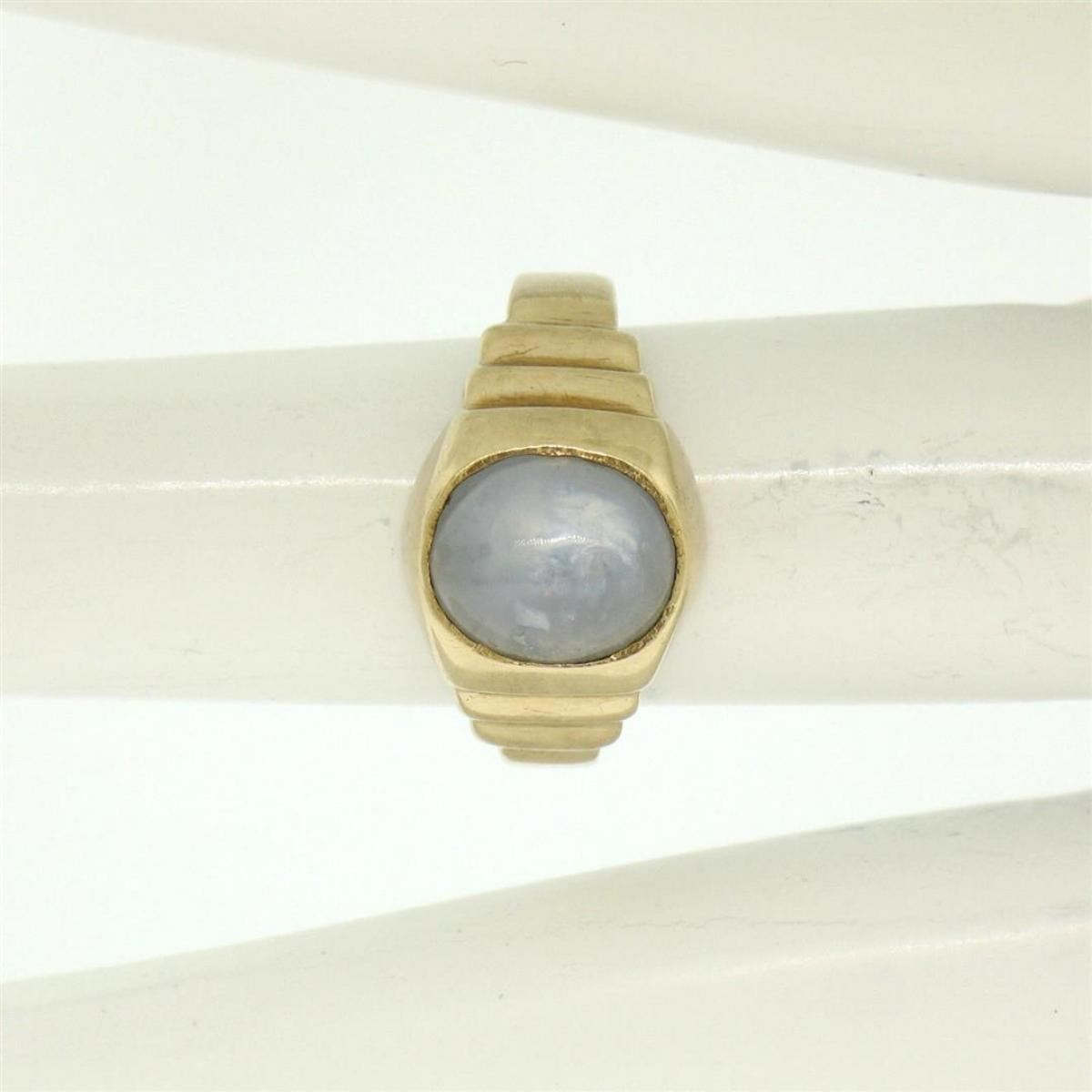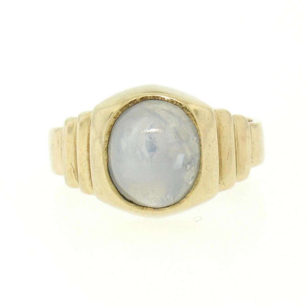 One Antique 14K Yellow Gold 3.50 ct Oval Bezel Set Star Sapphire Grooved Step Ring. Item Details - Material: 14K Solid Yellow Gold, Weight: 4.3 Grams, Stone(s): (1) Natural Genuine Star Sapphire - Oval Shape - Bezel Set - Light Bluish-Grey Color, Total Carat Weight: 3.50 (approx.), Ring Size: 4.5, Ring Width: 10.45mm, Ring Height: 6.08mm rise off the finger, Condition: Antique piece in excellent condition. Original patina has been preserved.
