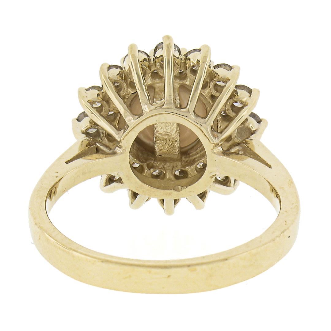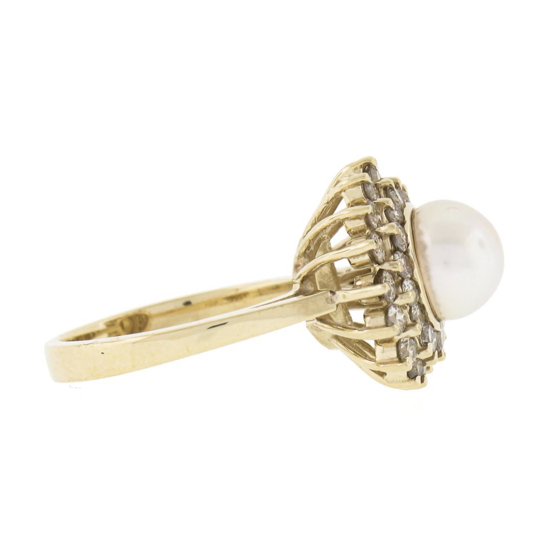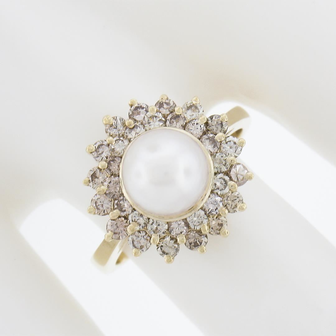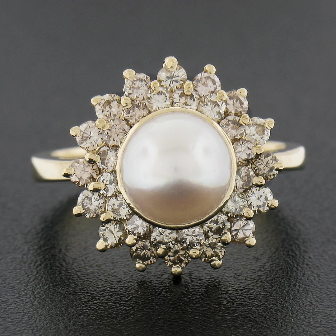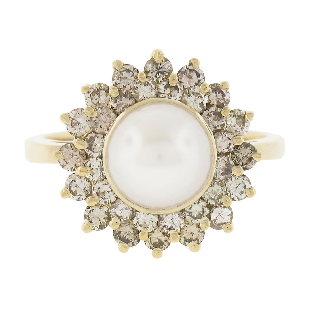 A solid 14k yellow gold ring, with 1 round shape cultured pearl (7.6mm), surrounded with doubel halo of 32 round cut fancy light champagne natural diamonds (VS2/SI1 ; 0.85ctw). The ring is size 6.5, weighs a total of 5.22 grams, and measures 14.8mm wide.