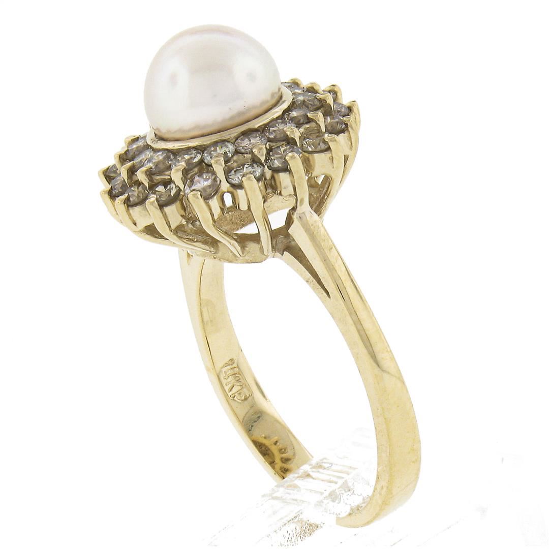 A solid 14k yellow gold ring, with 1 round shape cultured pearl (7.6mm), surrounded with doubel halo of 32 round cut fancy light champagne natural diamonds (VS2/SI1 ; 0.85ctw). The ring is size 6.5, weighs a total of 5.22 grams, and measures 14.8mm wide.