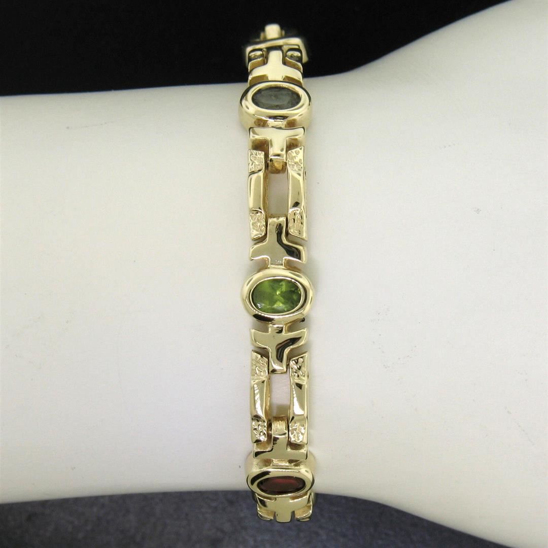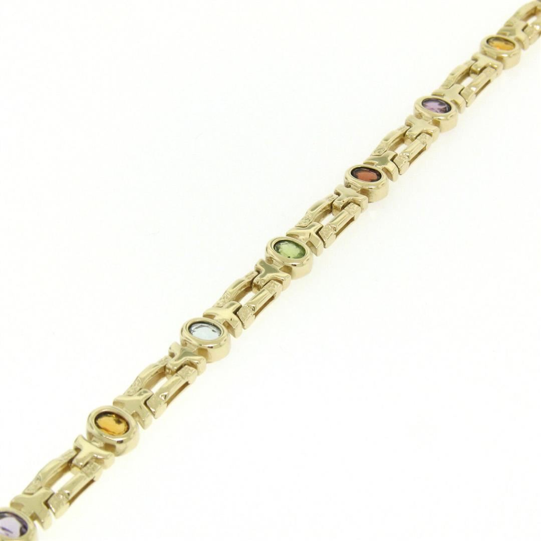 14K Yellow Gold 7" Fancy Link 2.0ctw Genuine Bezel Oval Multi Gemstone Bracelet. Please see photos and description for all available information. An estate solid 14k yellow gold link bracelet, featuring oval cut of 2 natural amethysts, 2 natural citrines, 1 natural peridots, 1 natural almandine garnet, 1 natural topaz (2.01ctw). It weighs a total of 19.41 grams, measures 7.70mm wide, and measures 7 inches in length.