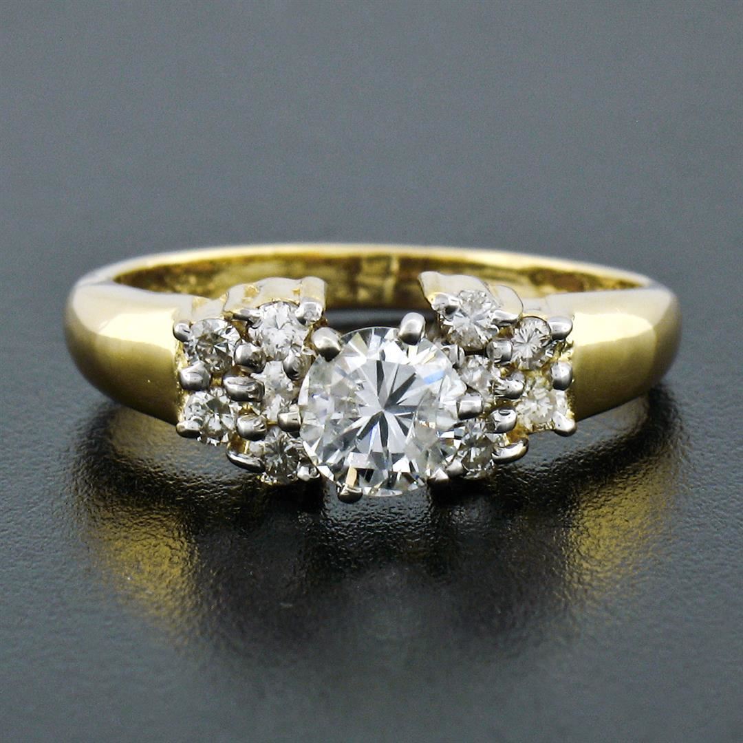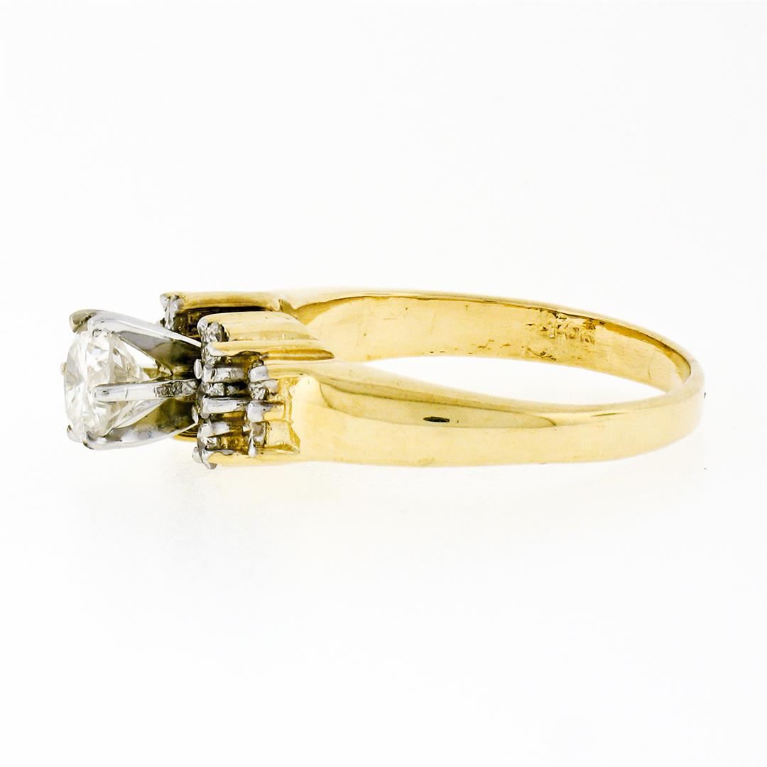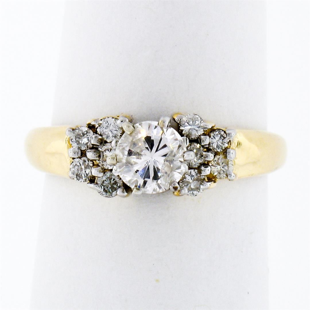 An estate solid 14k yellow and white gold tiered ring, with 1 round brilliant cut natural diamond (G - I1; 0.55ct), and 10 round brilliant cut natural diamonds (G/H- SI1; 0.30ctw). The ring is size 6.0, weighs a total of 4.22 grams, and measures 6.10mm wide.