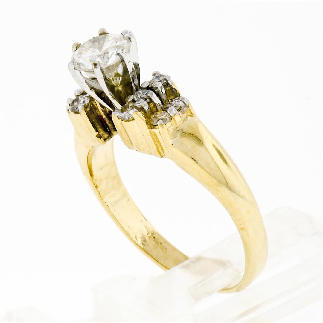 An estate solid 14k yellow and white gold tiered ring, with 1 round brilliant cut natural diamond (G - I1; 0.55ct), and 10 round brilliant cut natural diamonds (G/H- SI1; 0.30ctw). The ring is size 6.0, weighs a total of 4.22 grams, and measures 6.10mm wide.
