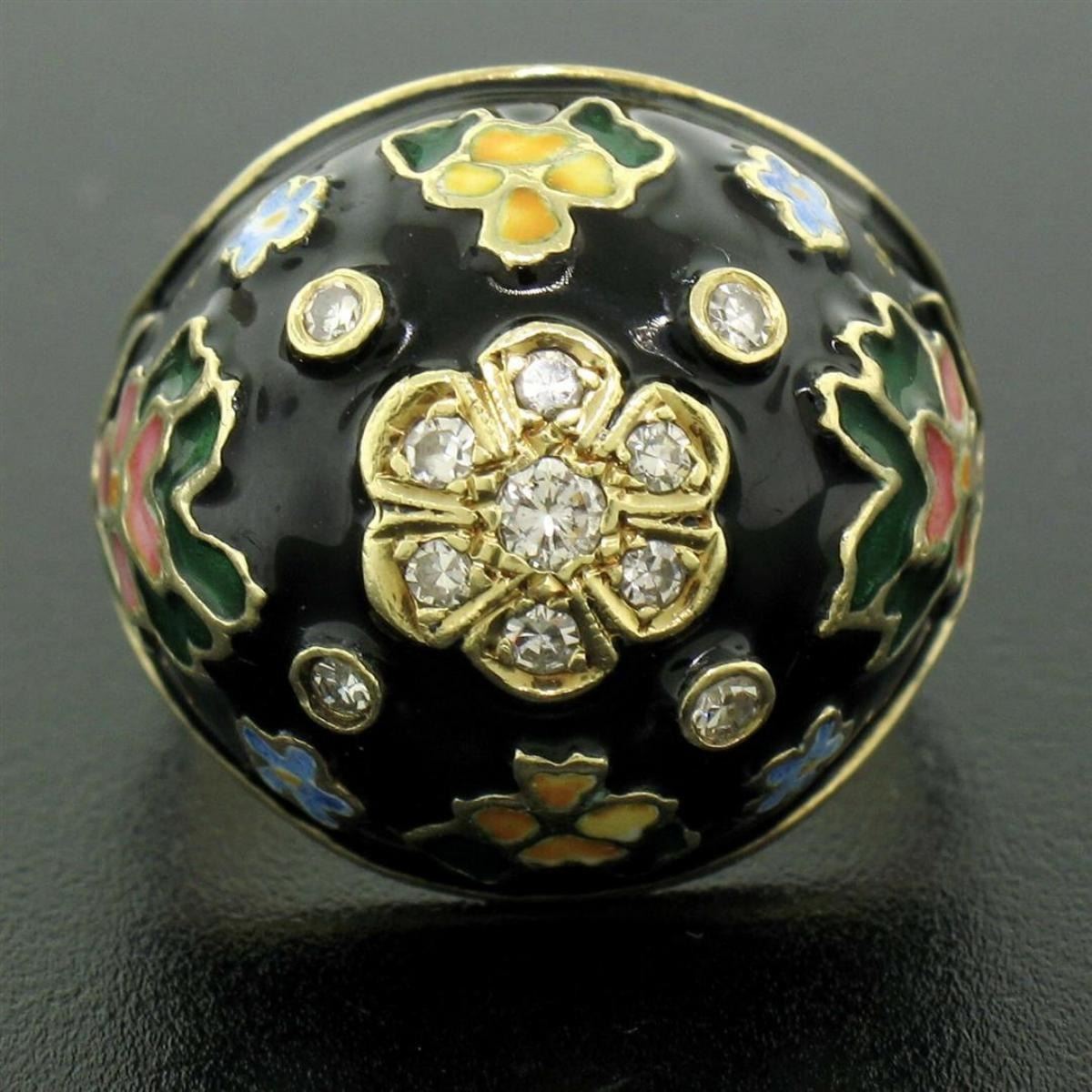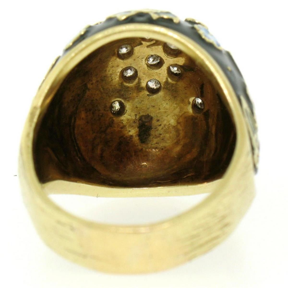 One Antique 14K Yellow Gold .30 ct Diamond Black Blue Green Yellow Enamel Flower Ring. Item Details: Material: 14K Solid Yellow Gold, Weight: 11.15 Grams, Stone(s): (7) Natural Genuine Diamonds - Round Single Cut - Prong Set - F/G Color - VS1/VS2 Clarity, (4) Natural Genuine Diamonds - Round Single Cut - Bezel Set - F/G Color - VS1/VS2 Clarity, Total Carat Weight: 0.30 (approx.), Ring Size: 8.0, Ring Width: 19.55mm, Ring Height: 10.13mm rise off the finger. Condition: Antique ring. Excellent condition. Very, VERY slight damage to enamel. Not easily noticeable but mentioned for accuracy.