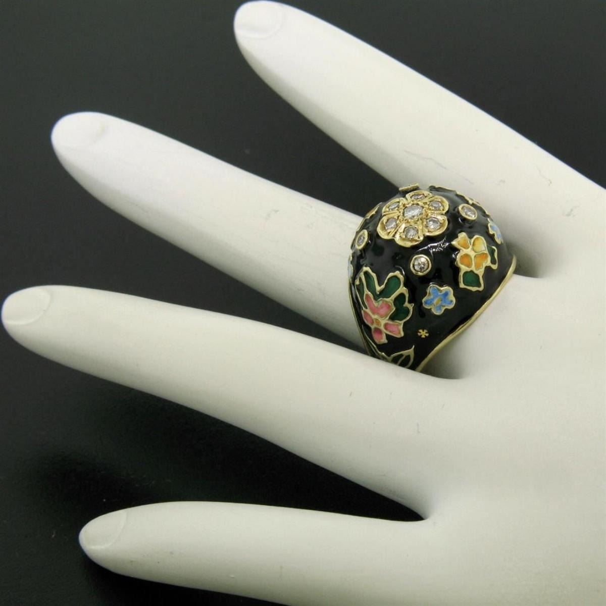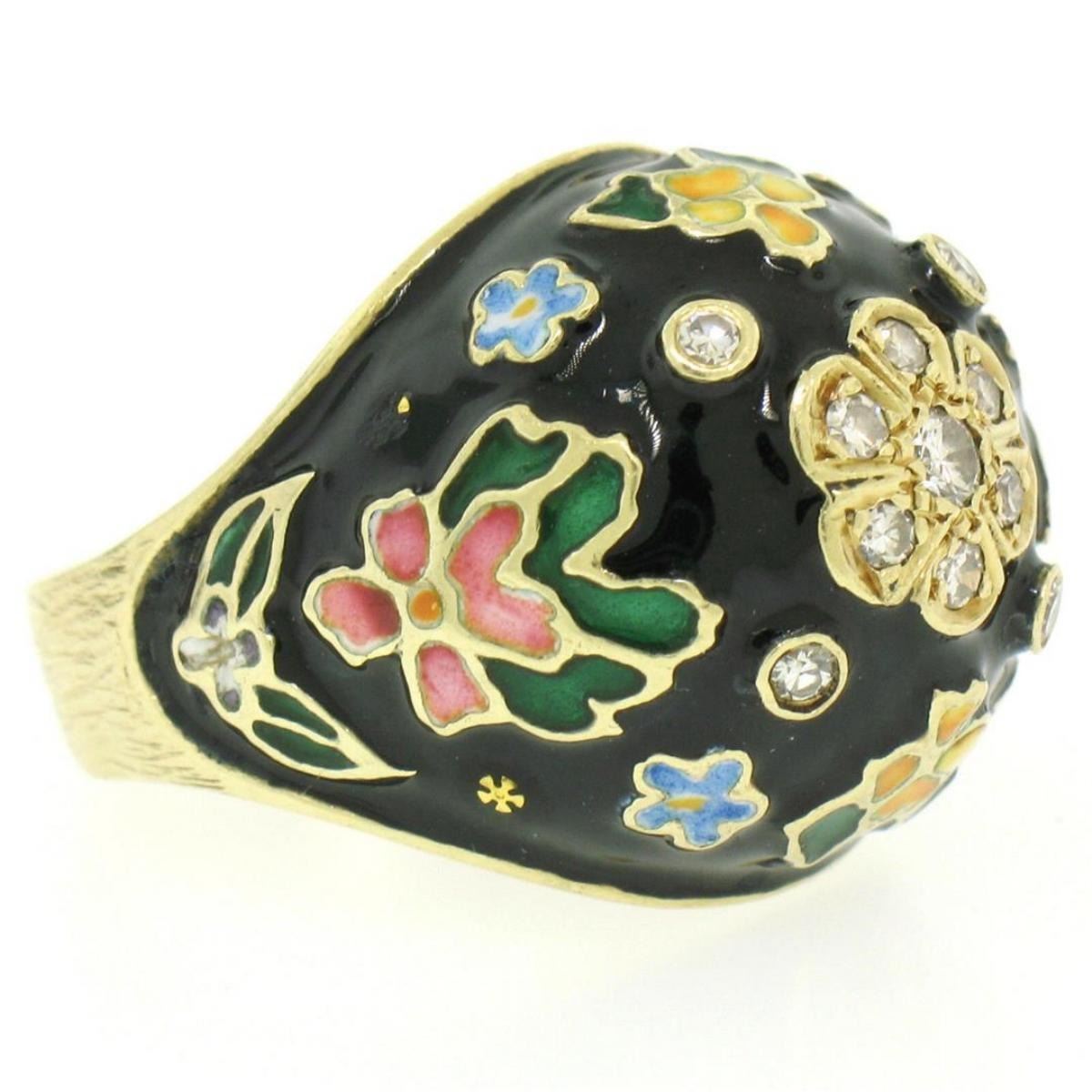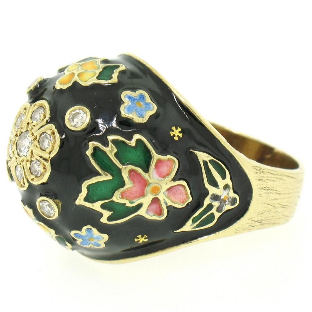 One Antique 14K Yellow Gold .30 ct Diamond Black Blue Green Yellow Enamel Flower Ring. Item Details: Material: 14K Solid Yellow Gold, Weight: 11.15 Grams, Stone(s): (7) Natural Genuine Diamonds - Round Single Cut - Prong Set - F/G Color - VS1/VS2 Clarity, (4) Natural Genuine Diamonds - Round Single Cut - Bezel Set - F/G Color - VS1/VS2 Clarity, Total Carat Weight: 0.30 (approx.), Ring Size: 8.0, Ring Width: 19.55mm, Ring Height: 10.13mm rise off the finger. Condition: Antique ring. Excellent condition. Very, VERY slight damage to enamel. Not easily noticeable but mentioned for accuracy.