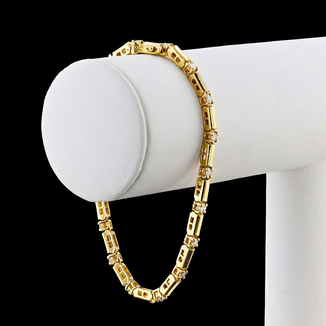 14K Yellow Gold Diamond Bracelet. Please see Photos and Description for all available information. This diamond bracelet is crafted in 14K yellow gold. The bracelet features 18 round brilliant diamonds weighing a total of 1.00 carat. The diamonds are set in a pave setting. The bracelet measures 7 1/4 inches long and secures with a lobster clasp.