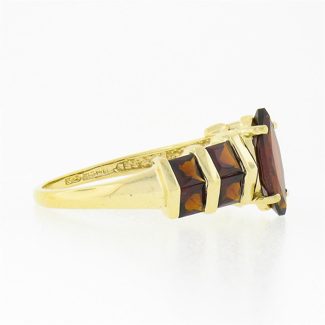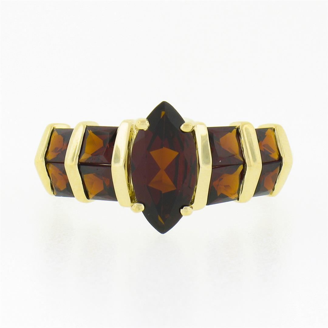 A solid 14k yellow gold ring, with 1 marquise brilliant cut natural garnet (9.9x5.0mm), and 8 square faceted cut natural garnets (2.7x2.7mm each). The ring is size 7.0, weighs a total of 2.60 grams, and measures 9.9mm wide.