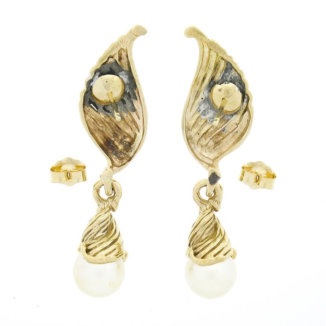 A solid 14k yellow gold dangle earrings, with 2 round shape cultured pearls (7.85mm each). The earrings measure approximately 41.90x10.70mm and weigh a total of 7.79 grams.