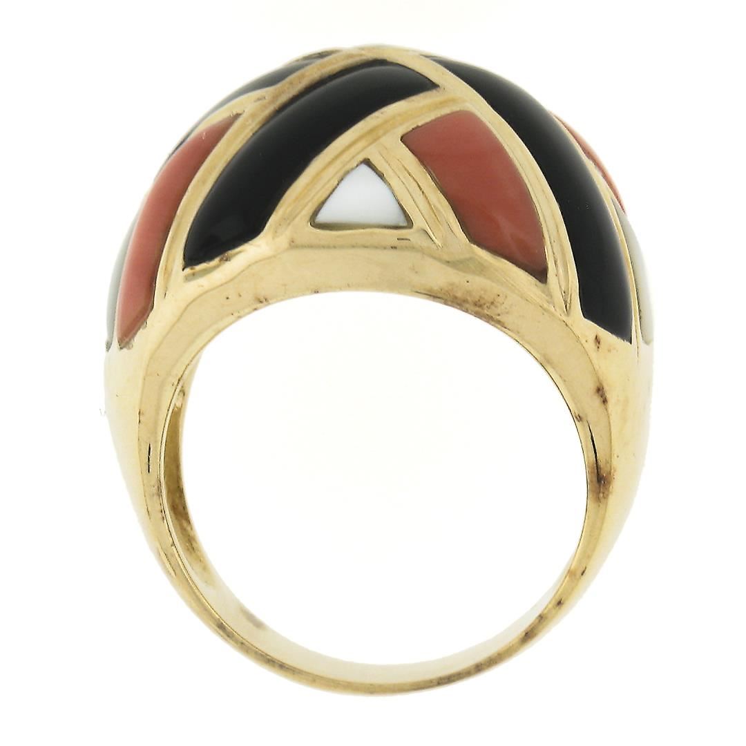 A solid 14k yellow gold domed ring with 4 custom cut natural balck onyx, 4 custom cut genuine mother of pearls, and 4 custom cut natural corals.The ring is size 6.5, weighs a total of 11.88 grams, and measures 19.4mm wide.