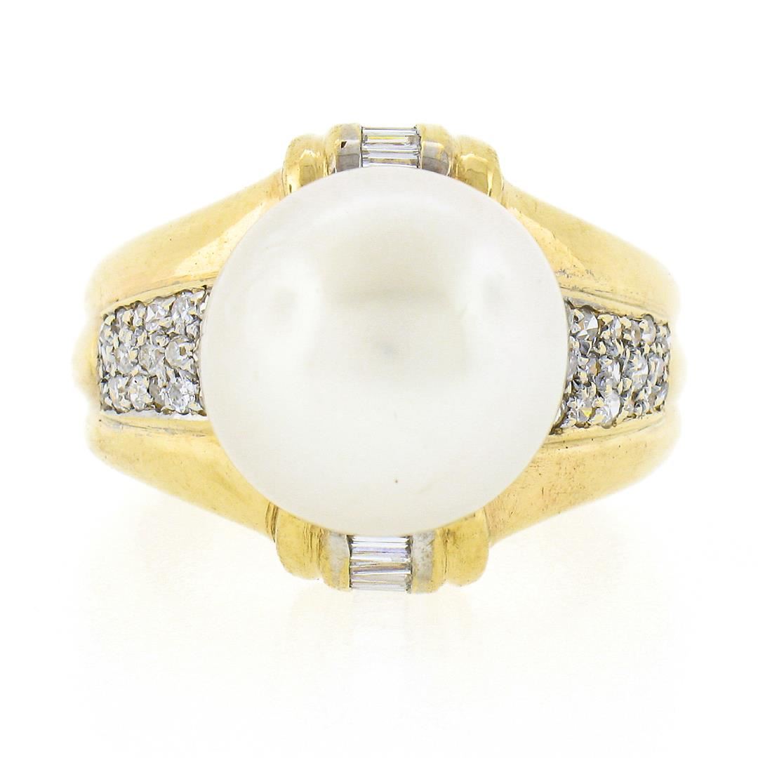 A solid 14k yellow gold ring, with 1 large round shape cultured south sea pearl (12.58mm), and 32 round brilliant w/ 12 baguette cut natural diamonds (G/H Color - SI1-I2 ; 0.56ctw). The ring is size 7.5, weighs a total of 10.80 grams, and measures 16.35mm wide.