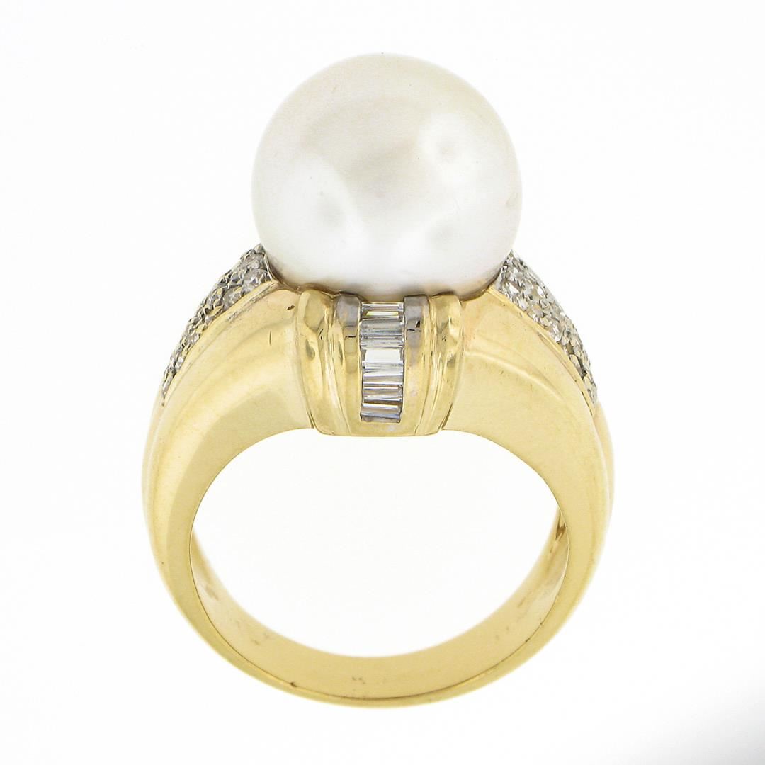 A solid 14k yellow gold ring, with 1 large round shape cultured south sea pearl (12.58mm), and 32 round brilliant w/ 12 baguette cut natural diamonds (G/H Color - SI1-I2 ; 0.56ctw). The ring is size 7.5, weighs a total of 10.80 grams, and measures 16.35mm wide.