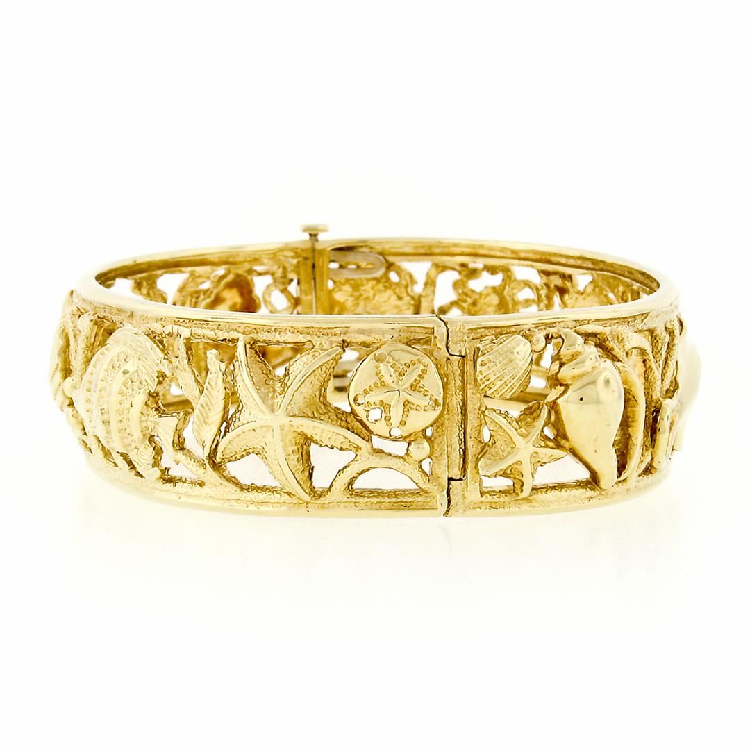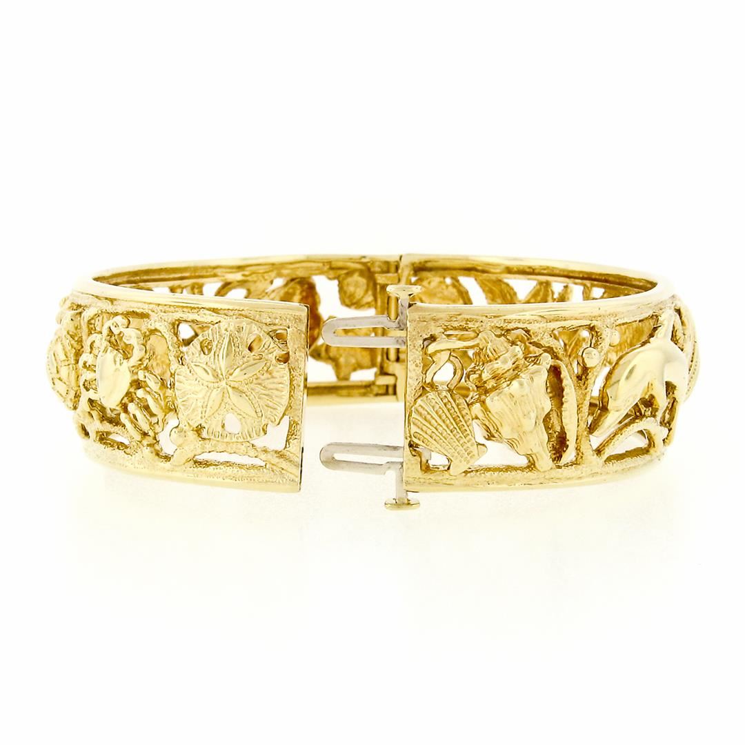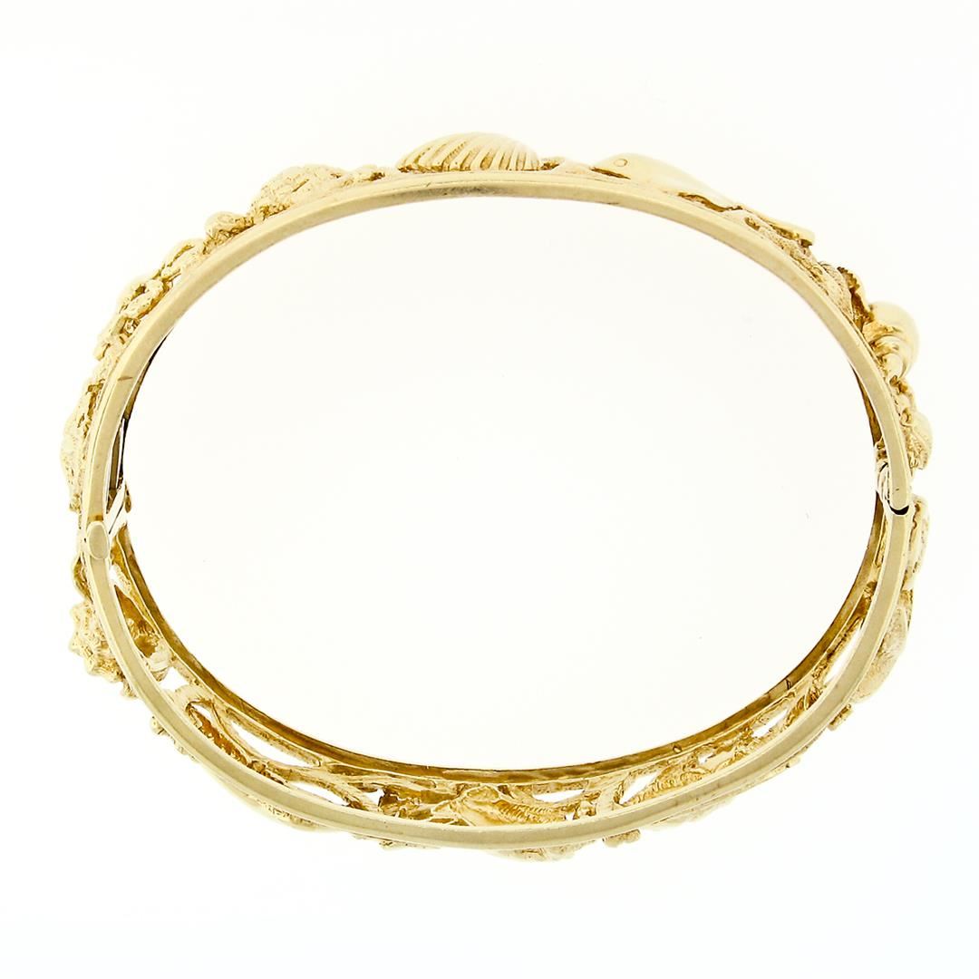 A solid 14k yellow gold open detailed hinged bangle bracelet. It weighs a total of 35.43 grams, measures 16.8mm wide, and measures 6.75 inches in length.