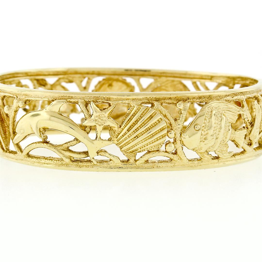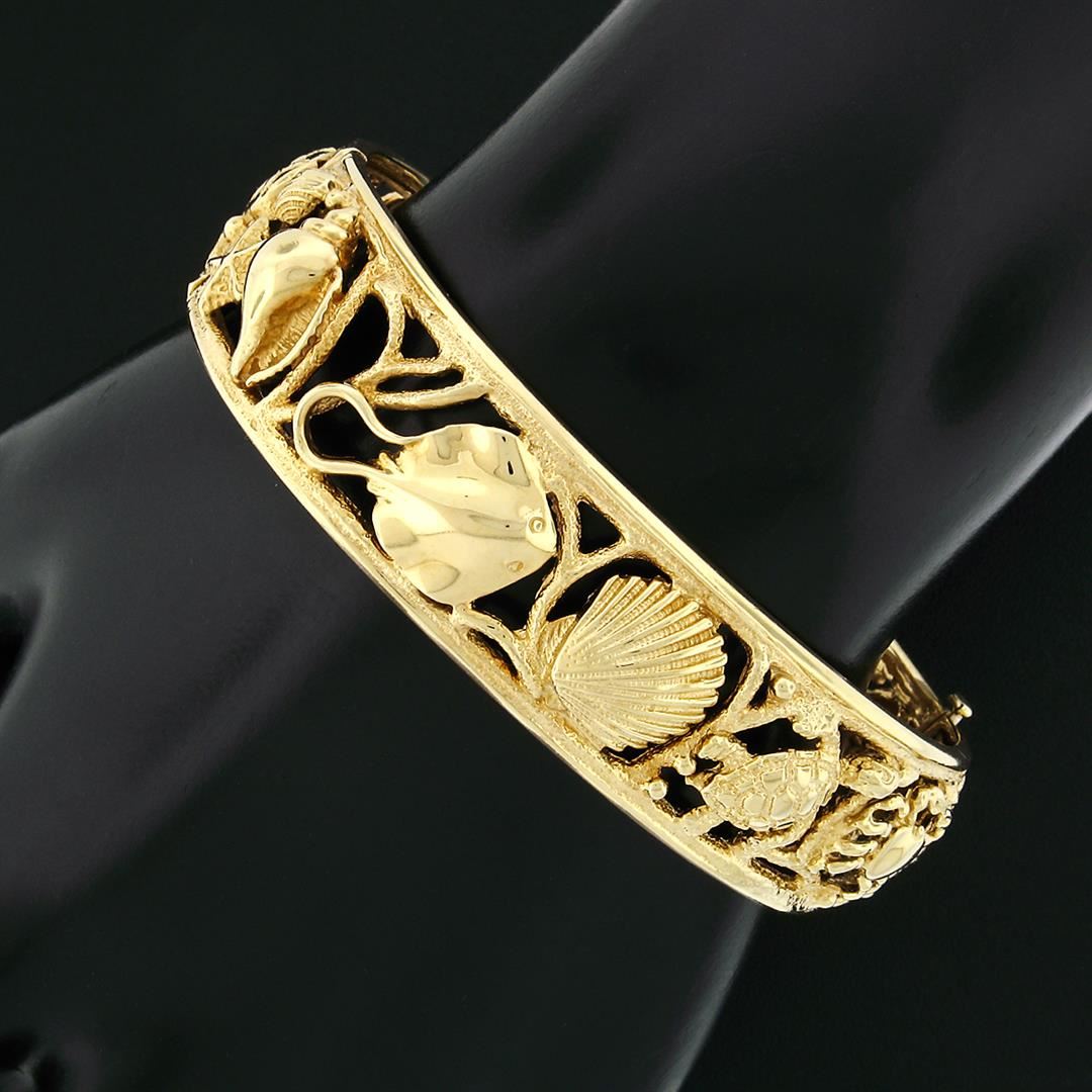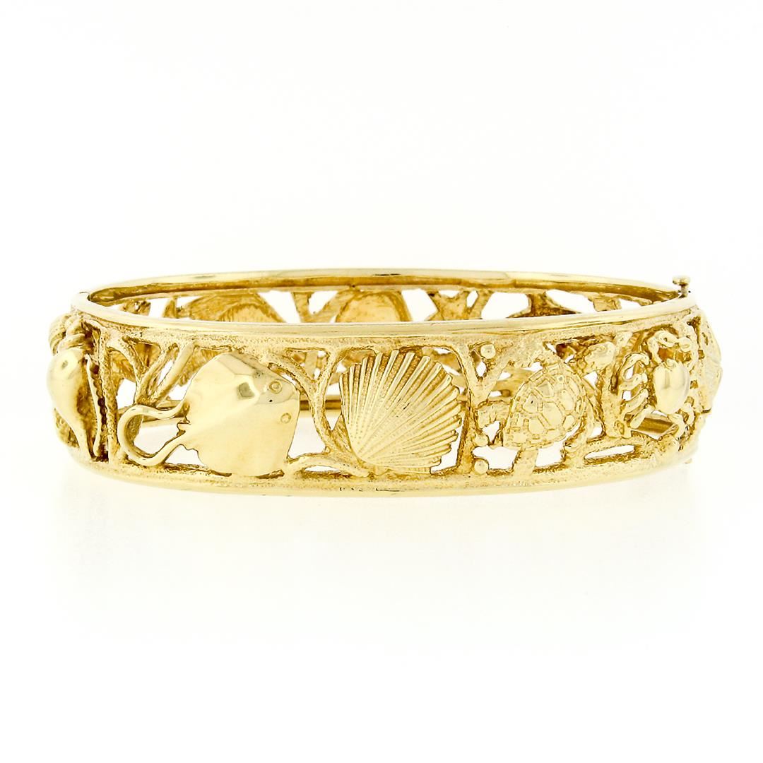 A solid 14k yellow gold open detailed hinged bangle bracelet. It weighs a total of 35.43 grams, measures 16.8mm wide, and measures 6.75 inches in length.