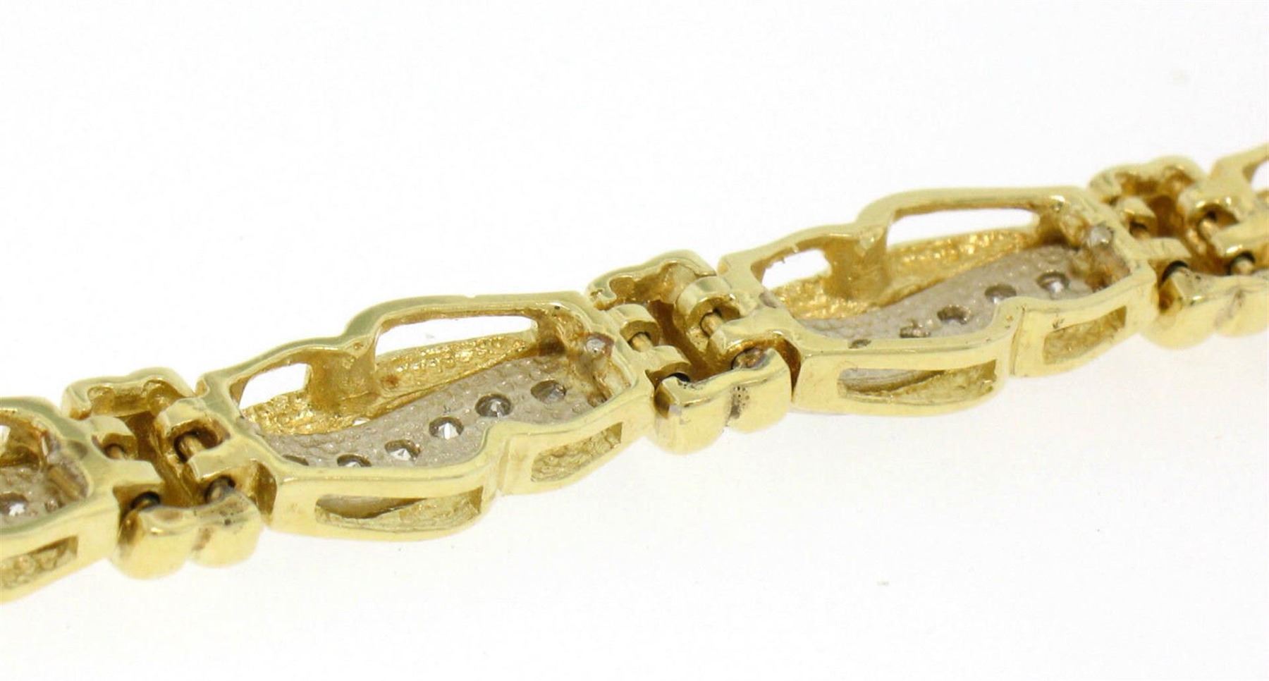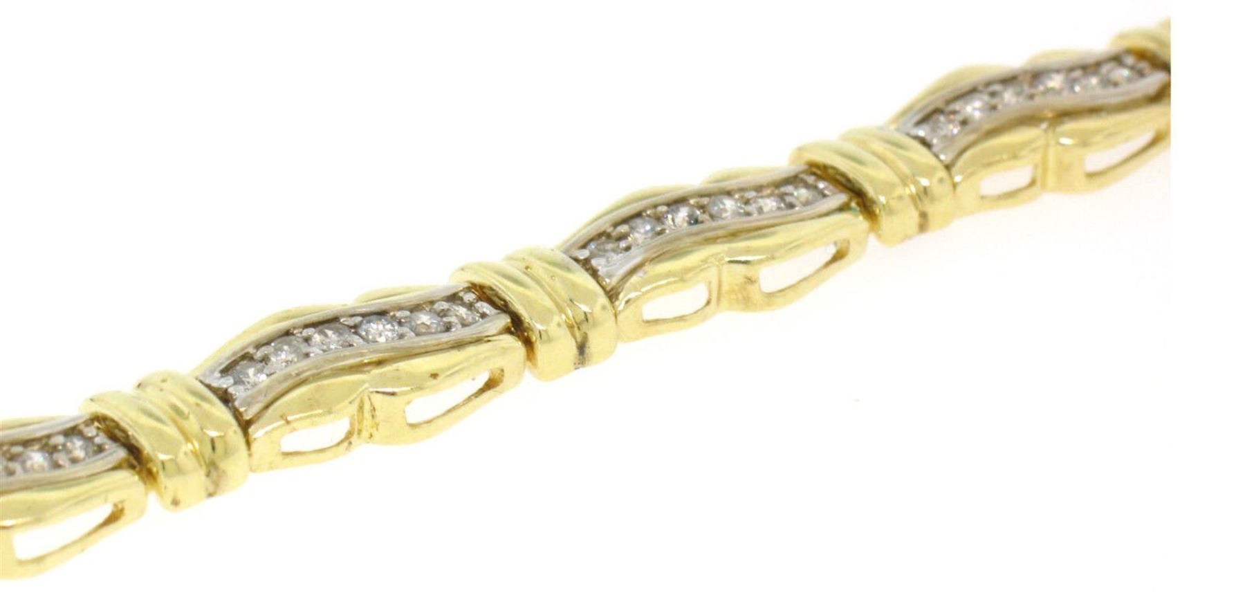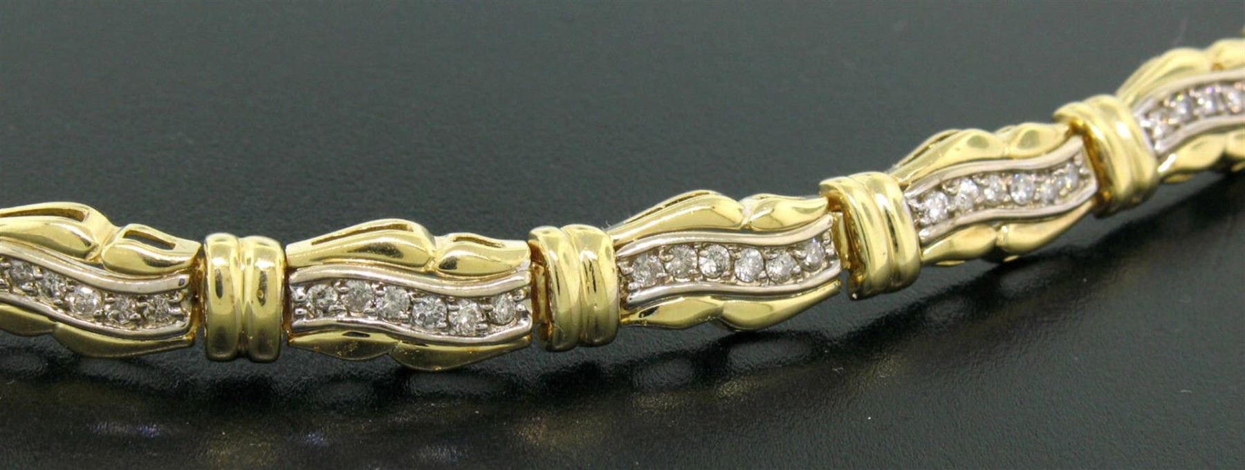 An Estate solid 14k yellow and white gold wavy bracelet, with 60 round brilliant cut natural diamonds (G/H - SI1 ; 1.50ctw). It weighs a total of 19.0 grams, measures 7.84mm wide, and measures 6.75 inches in length.