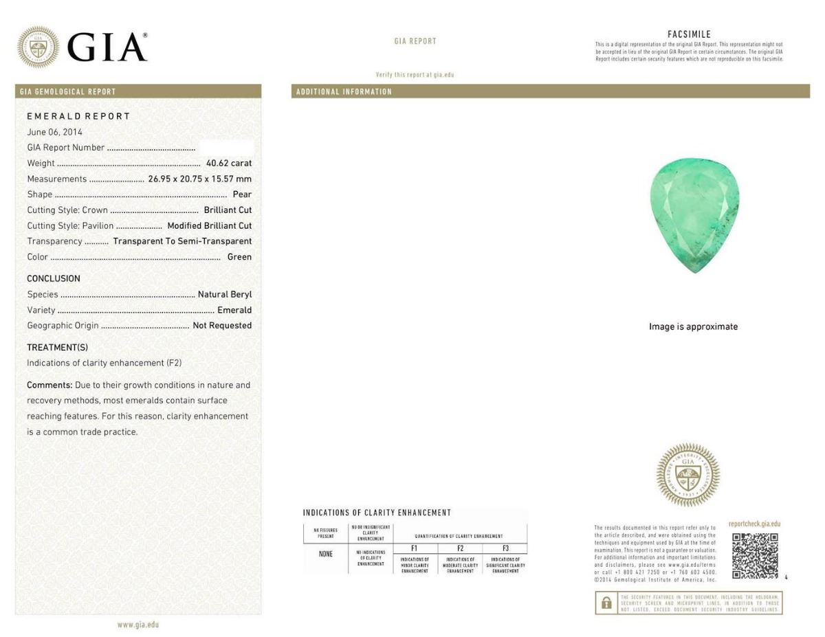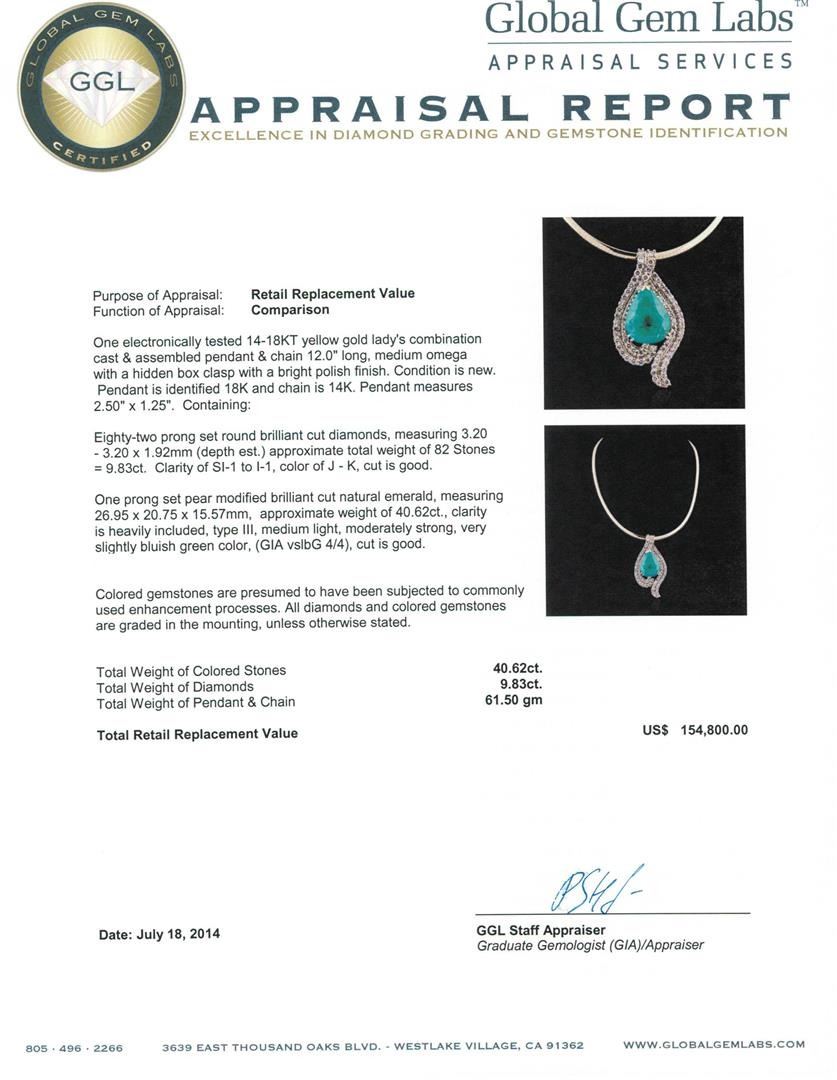 One electronically tested 14-18KT yellow gold Ladies combination cast & assembled pendant & chain 12.0 inch long, medium omega with a hidden box clasp with a bright polish finish. Condition is new. Pendant is identified 18K and chain is 14K. Pendant measures 2.50" x 1.25". Containing: Eighty-Two prong set round brilliant cut diamonds, measuring 3.20 - 3.20 x 1.92mm (depth est.) approximate. Total Weight of 82 Stones = 9.83ct. Clarity: SI-1 to I-1. Color: J - K, Cut is Good. One prong set pear modified brilliant cut natural emerald, measuring 26.95 x 20.75 x 15.57mm, approximate weight of 40.62ct., clarity is heavily included, type III, medium light, moderately strong, very slightly bluish green color, (GIA vslbG 4/4), cut is good. GIA REPORT: 2161211825Colored gemstones are presumed to have been subjected to commonly used enhancement processes. All diamonds and colored gemstones are graded in the mounting, unless otherwise stated. Total Weight of Colored Stones 40.62ct. Total Weight of Diamonds 9.83ct. Total Weight of Pendant & Chain 61.50 grams.. GGL Appraised at $154,800.00.
