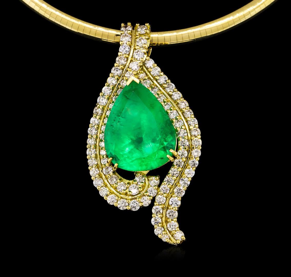 One electronically tested 14-18KT yellow gold Ladies combination cast & assembled pendant & chain 12.0 inch long, medium omega with a hidden box clasp with a bright polish finish. Condition is new. Pendant is identified 18K and chain is 14K. Pendant measures 2.50" x 1.25". Containing: Eighty-Two prong set round brilliant cut diamonds, measuring 3.20 - 3.20 x 1.92mm (depth est.) approximate. Total Weight of 82 Stones = 9.83ct. Clarity: SI-1 to I-1. Color: J - K, Cut is Good. One prong set pear modified brilliant cut natural emerald, measuring 26.95 x 20.75 x 15.57mm, approximate weight of 40.62ct., clarity is heavily included, type III, medium light, moderately strong, very slightly bluish green color, (GIA vslbG 4/4), cut is good. GIA REPORT: 2161211825Colored gemstones are presumed to have been subjected to commonly used enhancement processes. All diamonds and colored gemstones are graded in the mounting, unless otherwise stated. Total Weight of Colored Stones 40.62ct. Total Weight of Diamonds 9.83ct. Total Weight of Pendant & Chain 61.50 grams.. GGL Appraised at $154,800.00.
