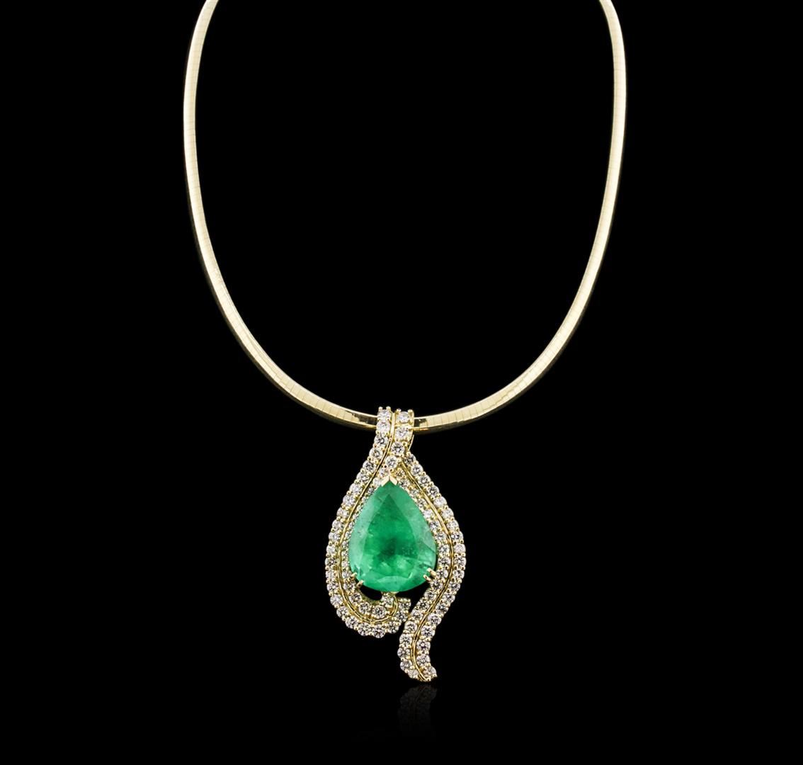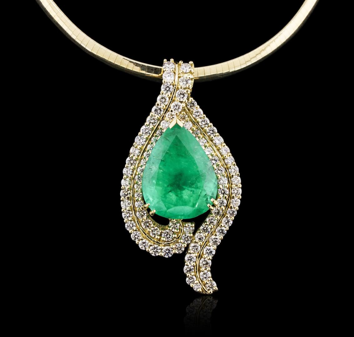 One electronically tested 14-18KT yellow gold Ladies combination cast & assembled pendant & chain 12.0 inch long, medium omega with a hidden box clasp with a bright polish finish. Condition is new. Pendant is identified 18K and chain is 14K. Pendant measures 2.50" x 1.25". Containing: Eighty-Two prong set round brilliant cut diamonds, measuring 3.20 - 3.20 x 1.92mm (depth est.) approximate. Total Weight of 82 Stones = 9.83ct. Clarity: SI-1 to I-1. Color: J - K, Cut is Good. One prong set pear modified brilliant cut natural emerald, measuring 26.95 x 20.75 x 15.57mm, approximate weight of 40.62ct., clarity is heavily included, type III, medium light, moderately strong, very slightly bluish green color, (GIA vslbG 4/4), cut is good. GIA REPORT: 2161211825Colored gemstones are presumed to have been subjected to commonly used enhancement processes. All diamonds and colored gemstones are graded in the mounting, unless otherwise stated. Total Weight of Colored Stones 40.62ct. Total Weight of Diamonds 9.83ct. Total Weight of Pendant & Chain 61.50 grams.. GGL Appraised at $154,800.00.