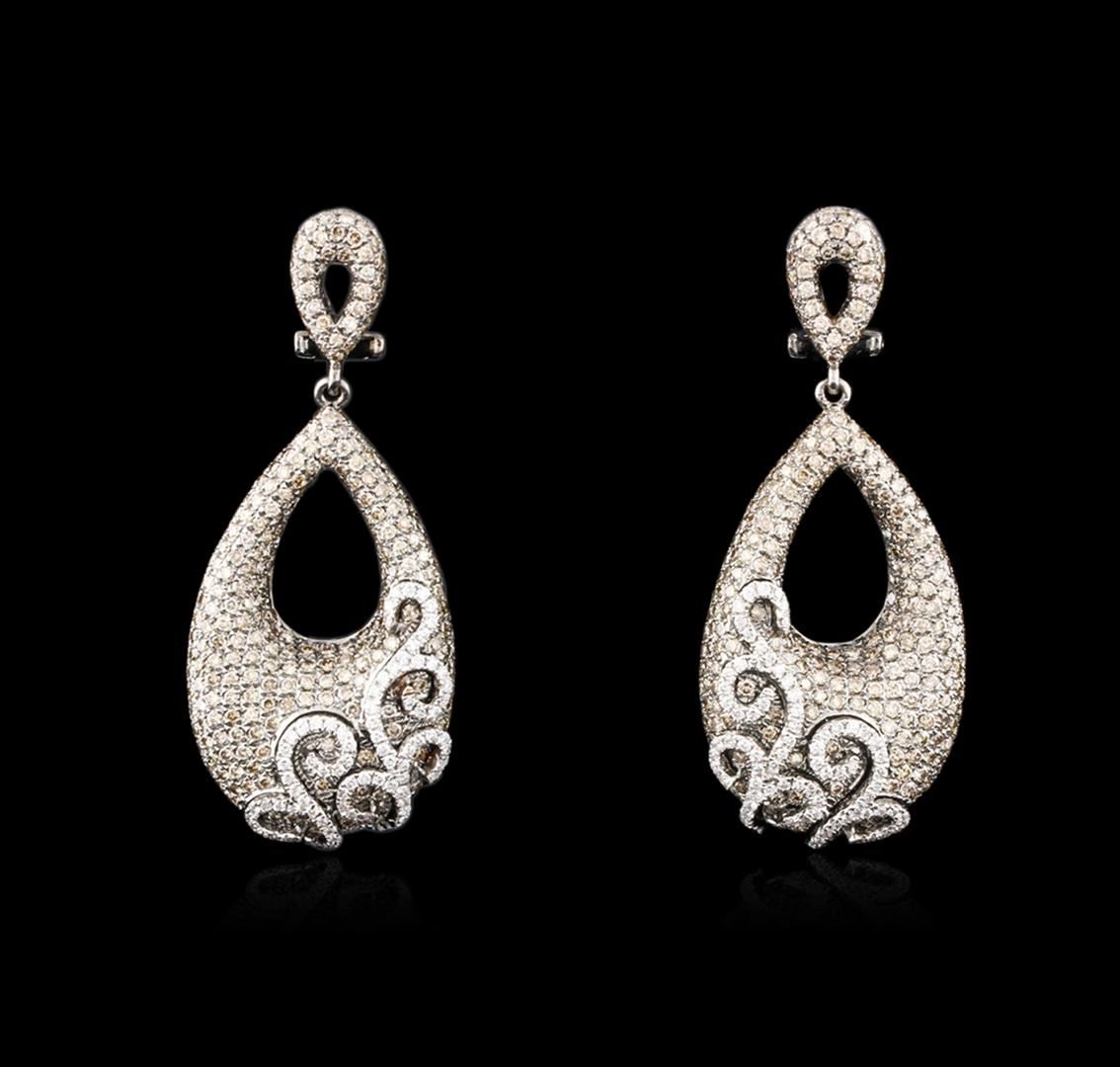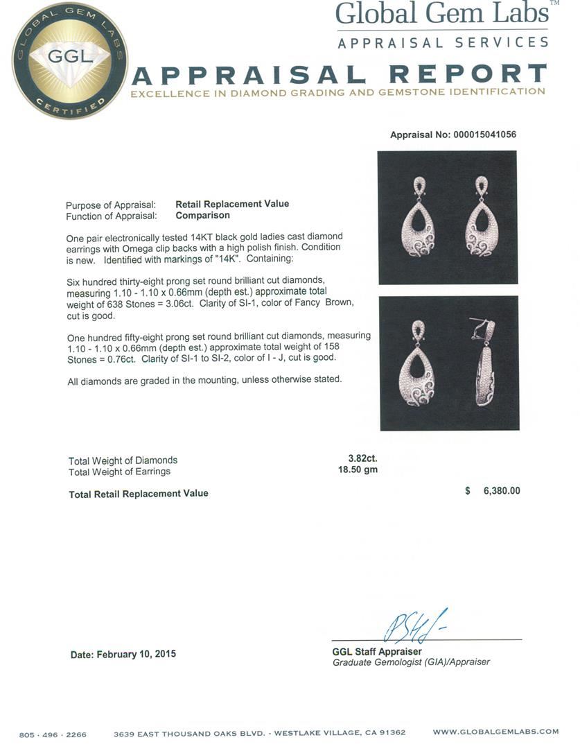 One pair electronically tested 14KT black gold ladies cast diamond earrings with Omega clip backs with a high polish finish. Identified with markings of "14K". Condition is new. Containing: Six Hundred Thirty-Eight prong set round brilliant cut diamonds, measuring 1.10 - 1.10 x 0.66mm (depth est.) approximate total weight of 638 Stones = 3.06ct. Clarity: SI-1, color of Fancy Brown, Cut is Good. One Hundred Fifty-Eight prong set round brilliant cut diamonds, measuring 1.10 - 1.10 x 0.66mm (depth est.) approximate total weight of 158 Stones = 0.76ct. Clarity: SI-1 to SI-2. Color: I - J, Cut is Good. All diamonds are graded in the mounting, unless otherwise stated. Total Weight of Diamonds 3.82ct. Total Weight of Earrings 18.50 grams. GGL Appraised at $6,380.00.
