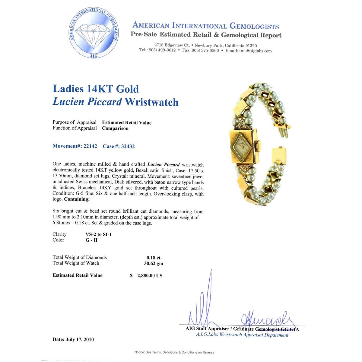 One ladies, machine milled & hand crafted Lucien Piccard wristwatch electronically tested 14KT yellow gold. Condition: G-5 Fine. Six and one half inch length. Six bright cut and bead set round brilliant cut diamonds, approx. weight of 0.18ct. Total weight of watch 30.62 gm. AIG Appraised at $2,880.00.