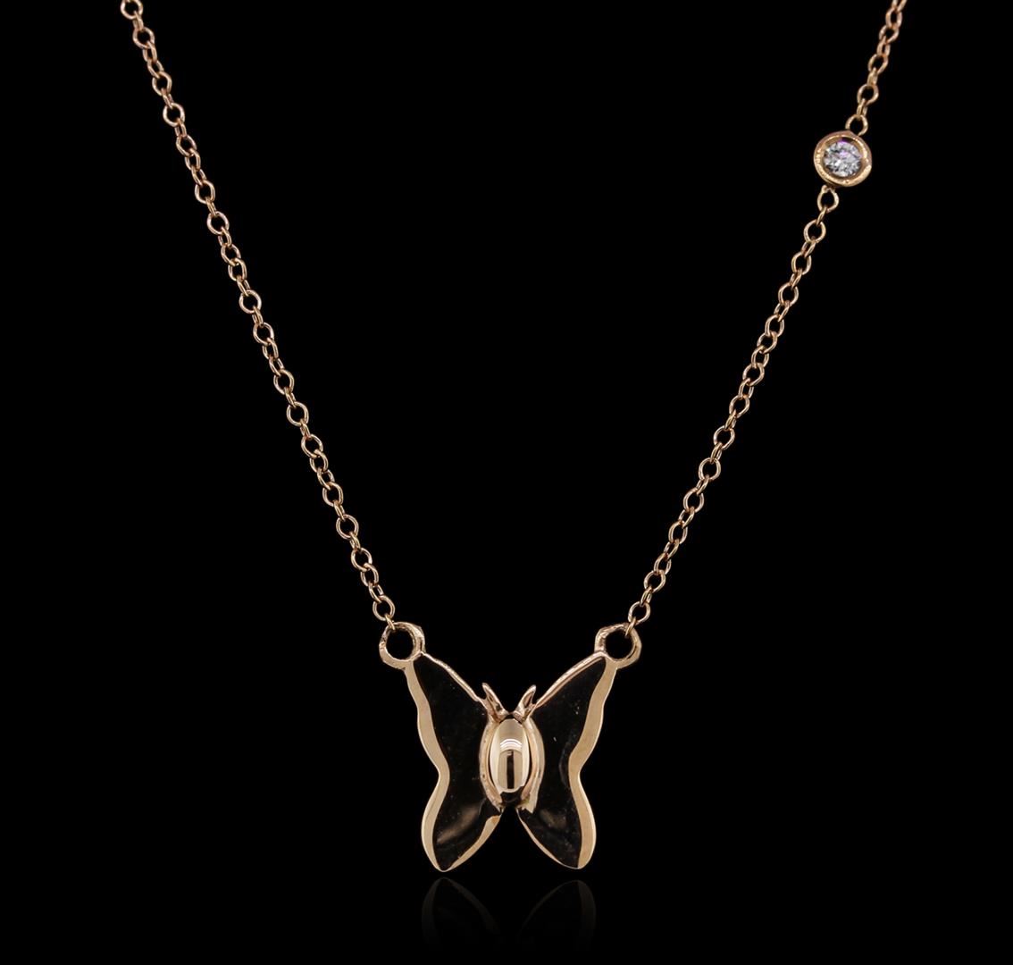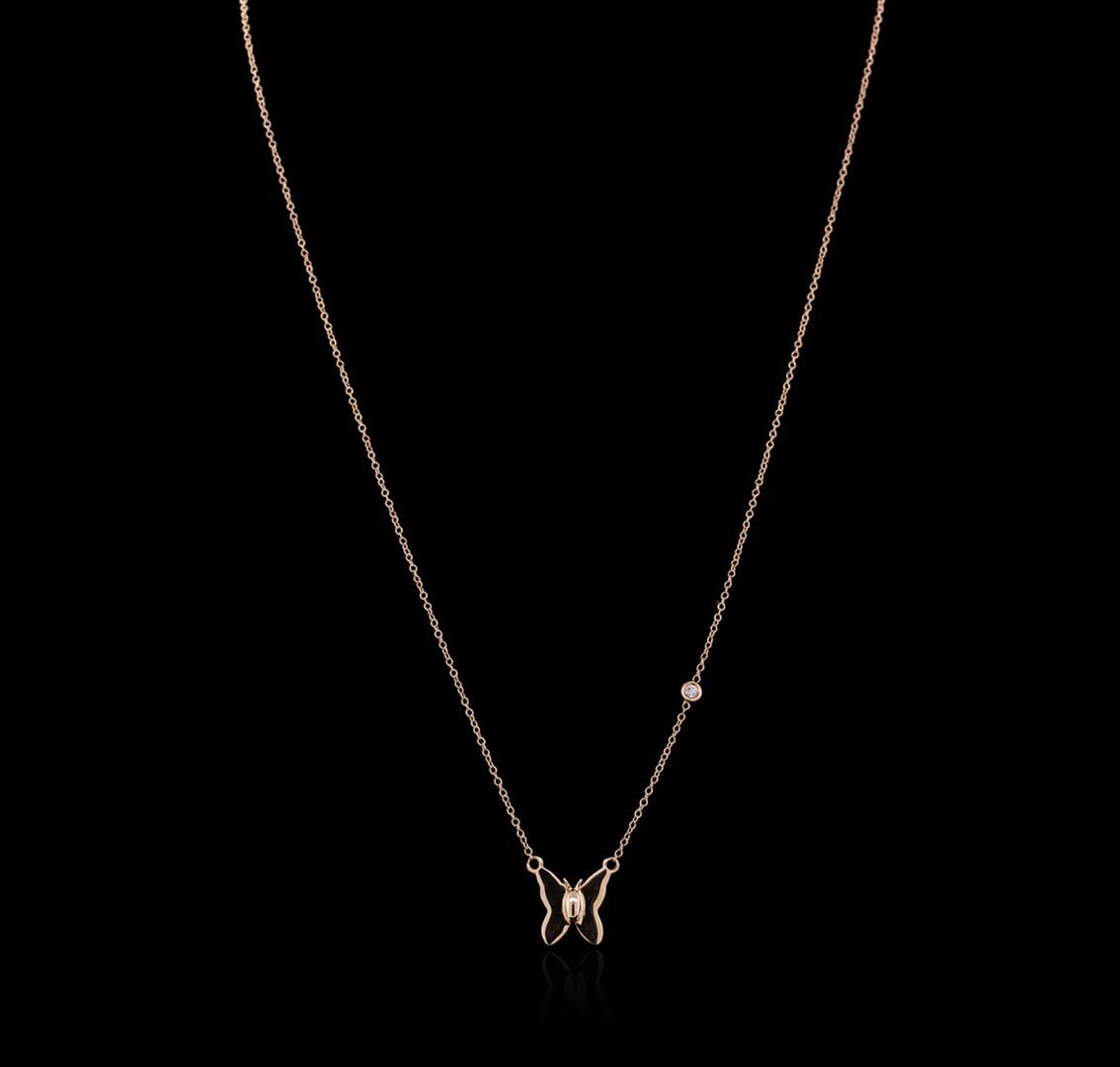 One butterfly necklace featuring: 14KT rose gold weighing 2.09 grams containing one diamond with a total weight of 0.03ct.